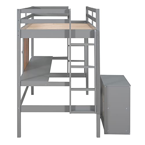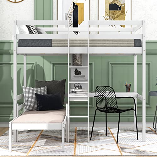 Merax Loft Bed Full Size, Wooden Loft Bed Frame with Desk, Cabinet, Writing Board & 2-Ladder, Convenient for Teens Adults (White)
