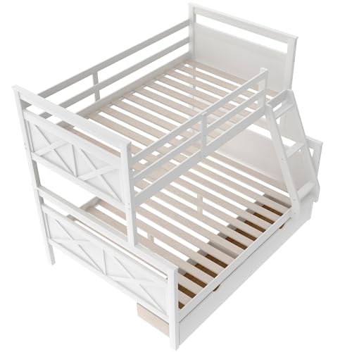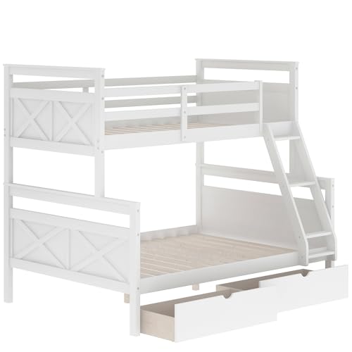 Twin Over Full Bunk Bed with Ladder, Full Length Guardrail, X-Shape Headboard and Footboard, Wooden Bunk Bed Frame Can be Separated into 2 Beds, White