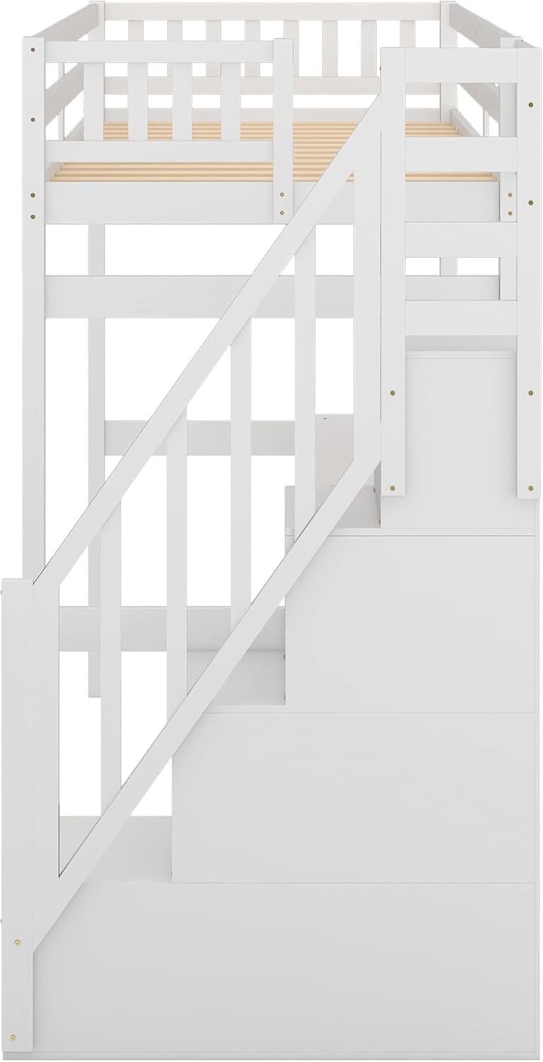 MERITLINE Twin Over Twin Bunk Beds with Stairs and Storage Drawers, Wooden Bunk Bed Frame with Guardrails and Storage Shelves, for Kids Boys Girls Teens Adults,No Box Spring Needed (White)
