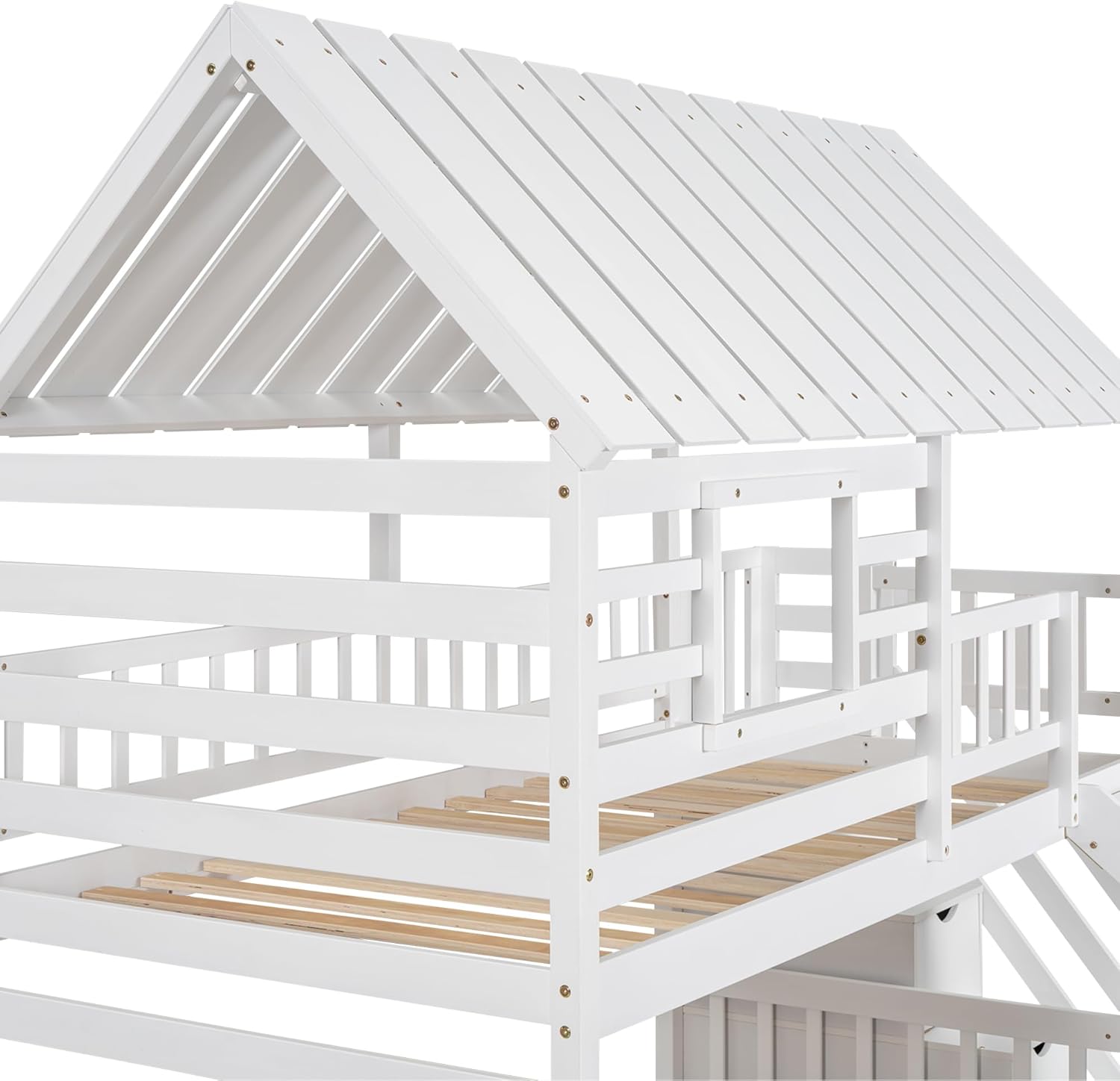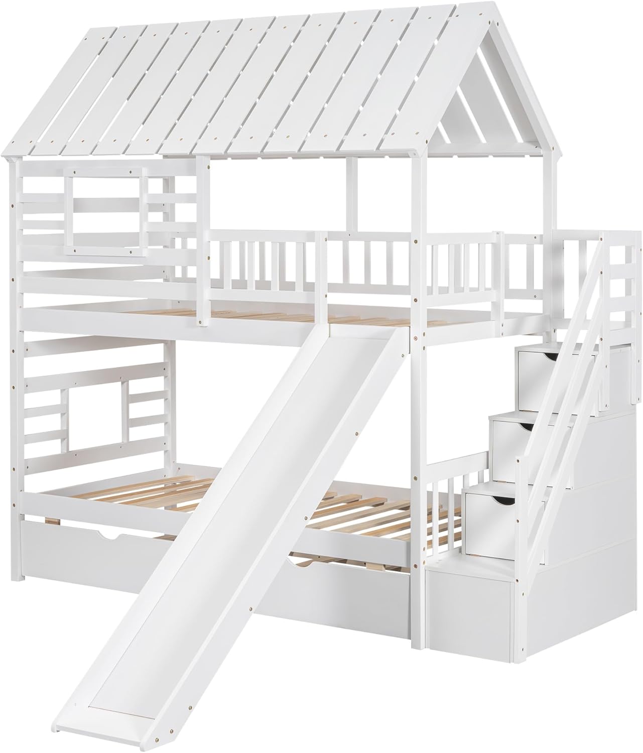 Twin Over Twin House Bunk Bed with Slide, Stairs Storage and Trundle, Wooden Versatile Bunkbeds w/Roof and Window for Kids Boys Girls Bedroom, White