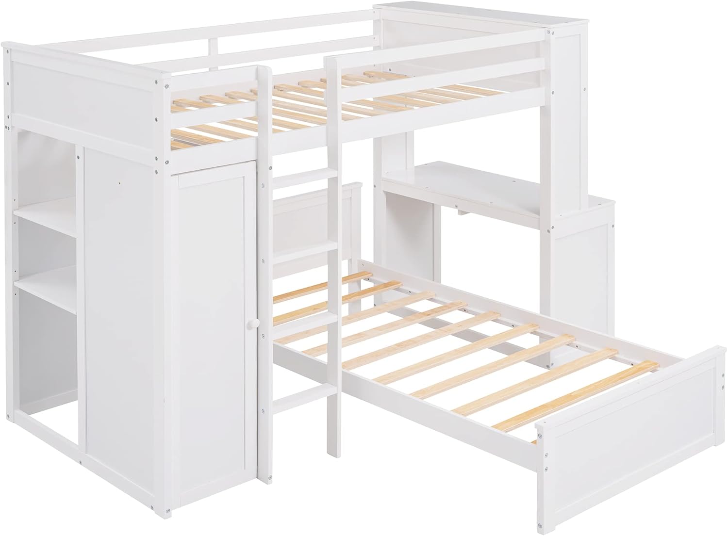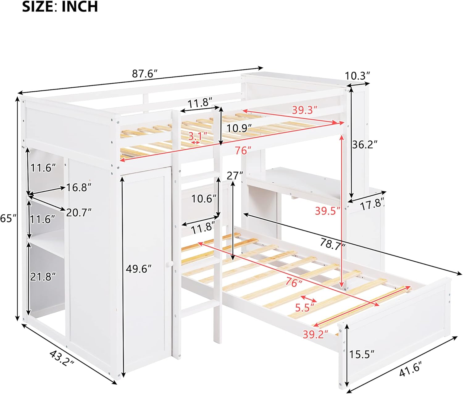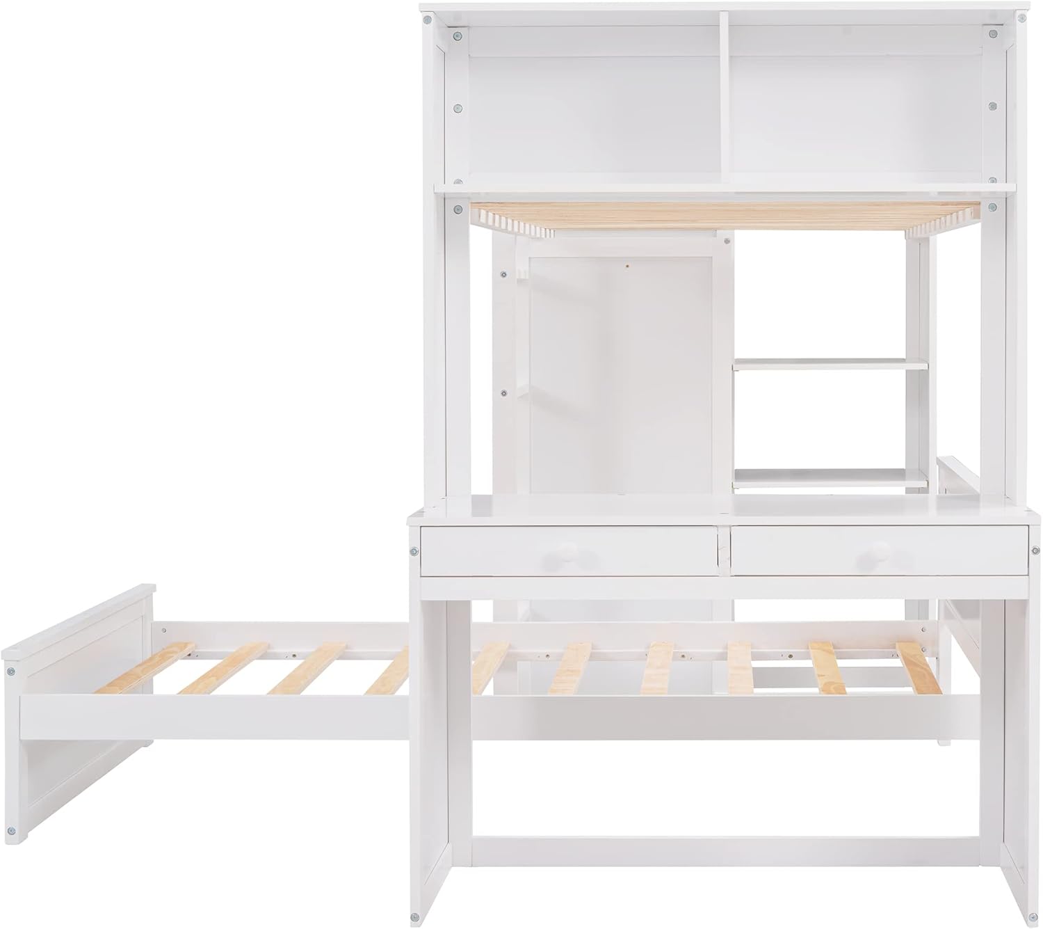 Twin Wooden Bunk Loft Bed with Shelves Desk and Wardrobe for Kids Teens Adults, White