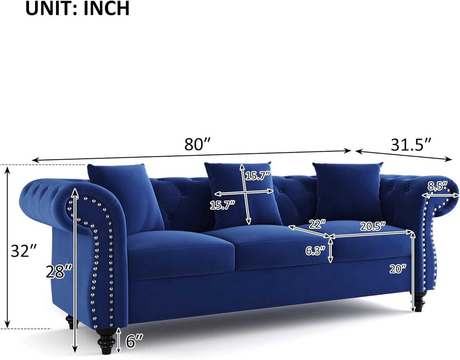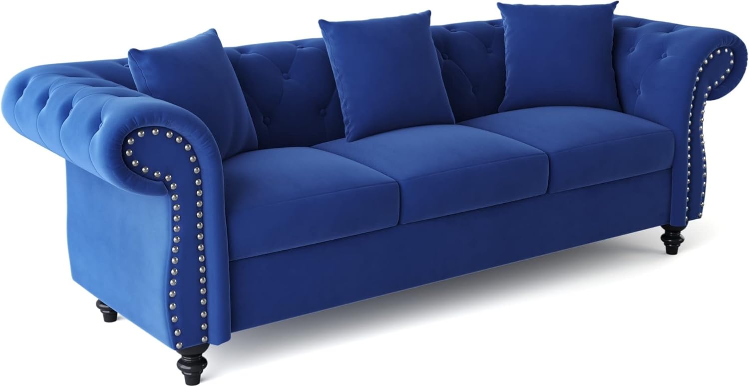 80" Chesterfield Sofa Tufted Velvet Upholstered 3-Seater Sofa Scrolled Arms with Nailhead Decoration,3 Pillows Included