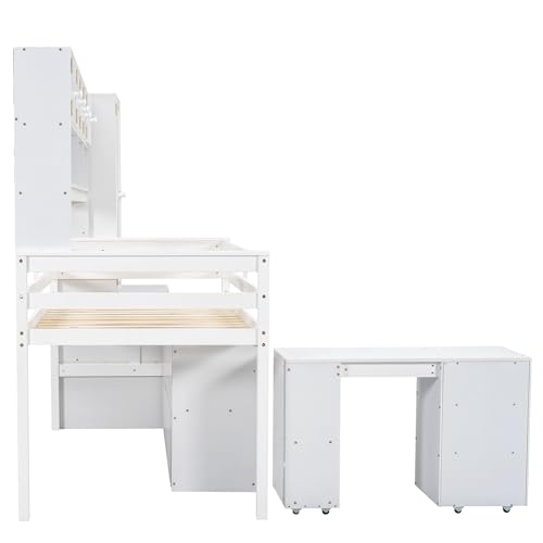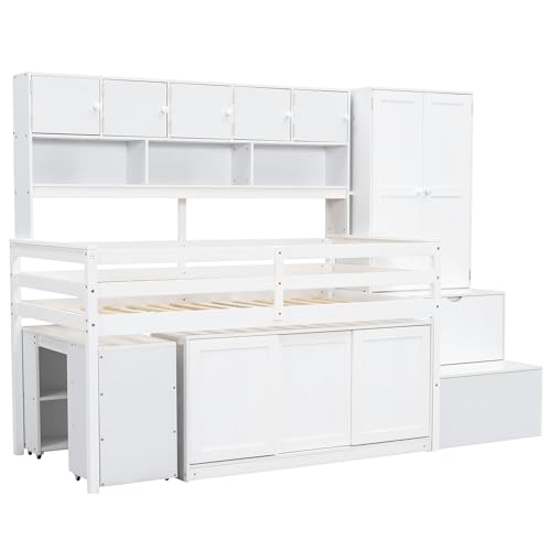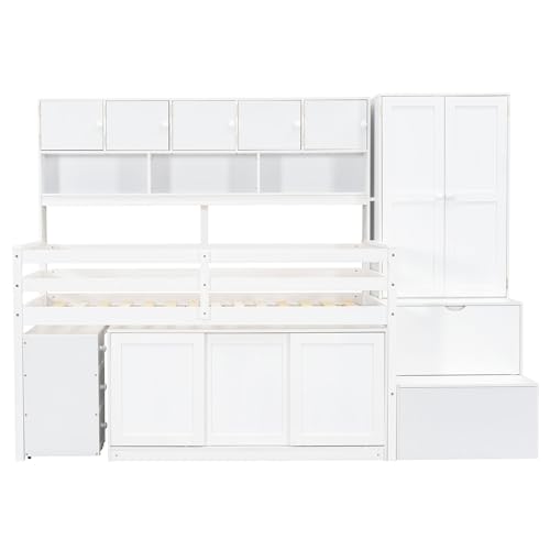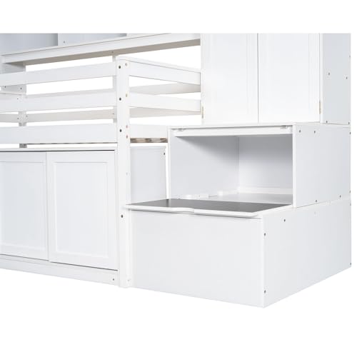 Multifunctional Loft Bed with Cabinets and Wardrobe Wood Loft Bed with Pull Out Desk and Stairs, Full Size