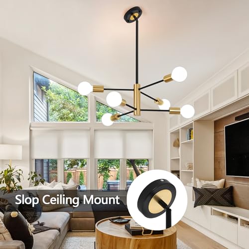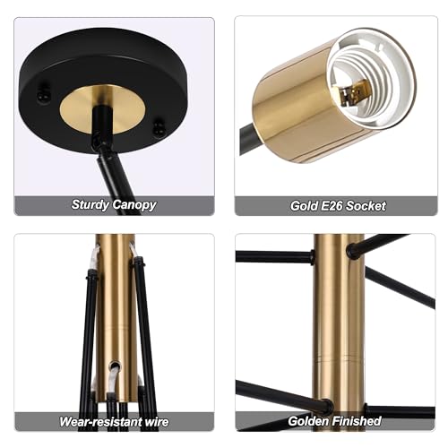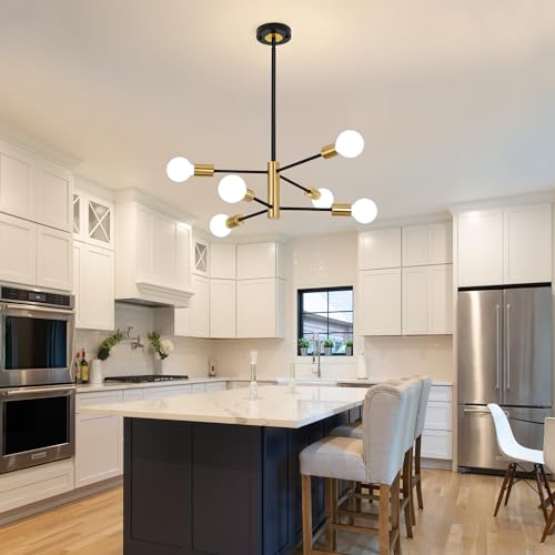 6-Light Sputnik Chandelier for Dining Room, Black Gold Modern Mid Century Chandeliers, E26 Base, Branch Height Adjustable Pendant Sputnik Lighting Fixture for Kitchen Island Living Room