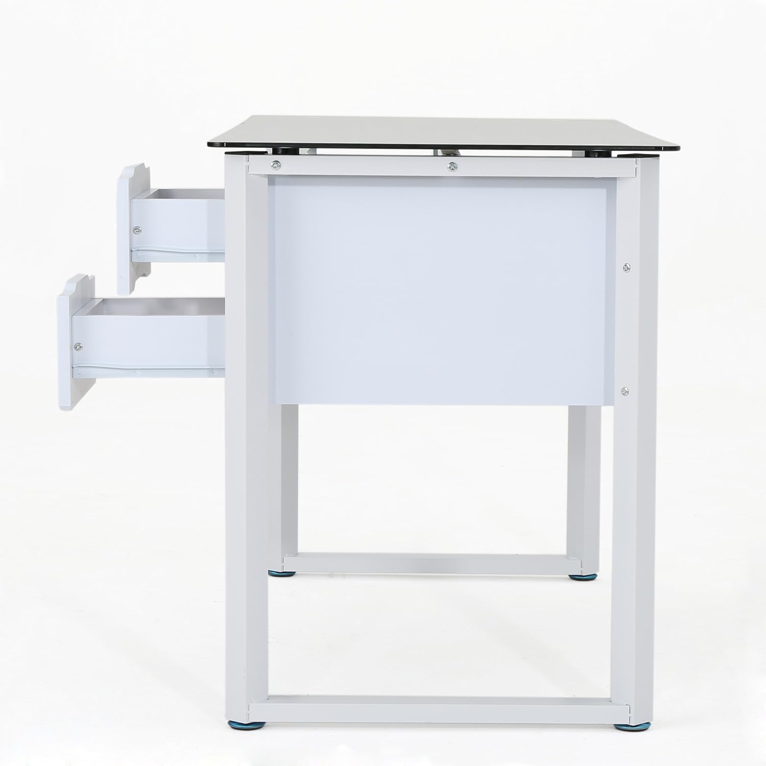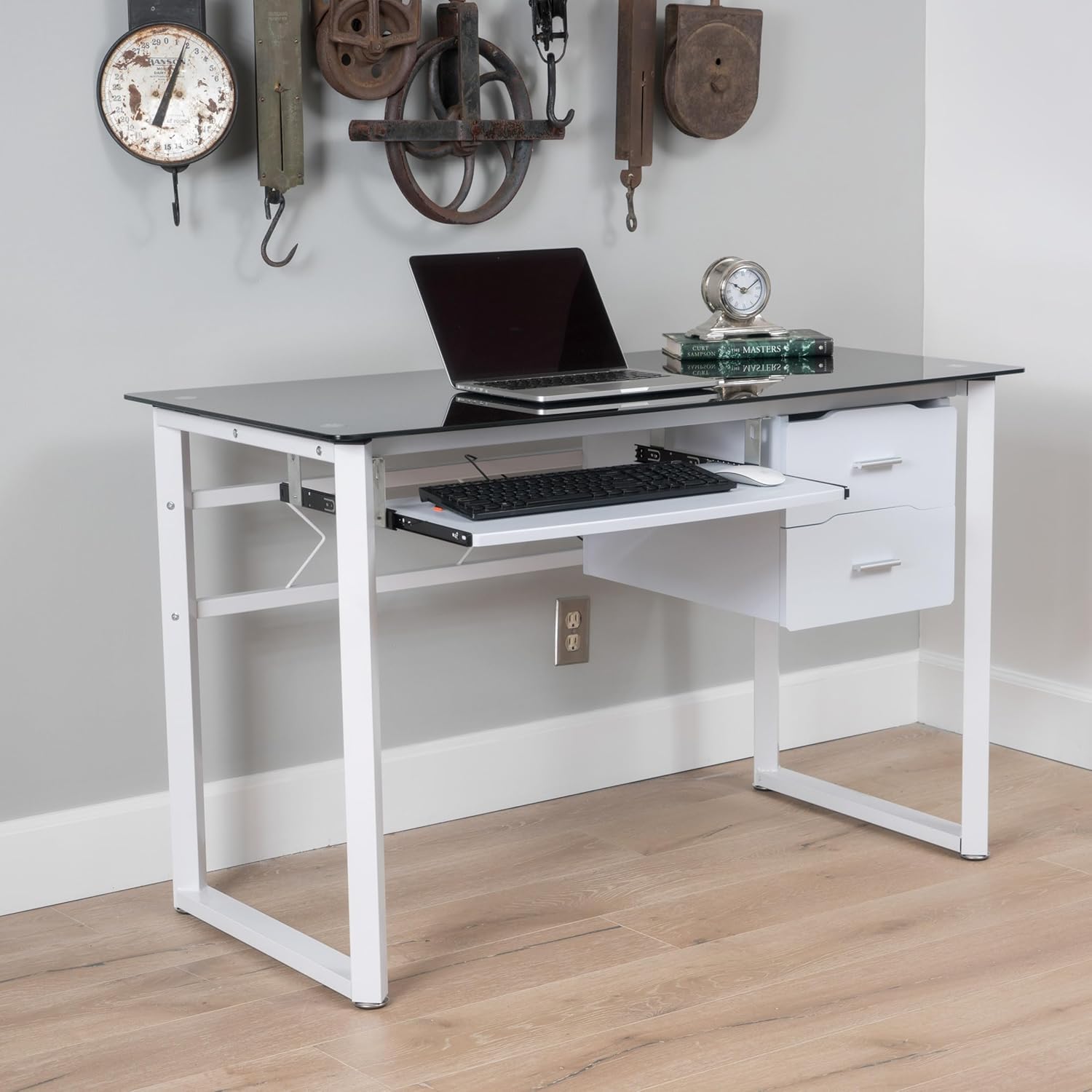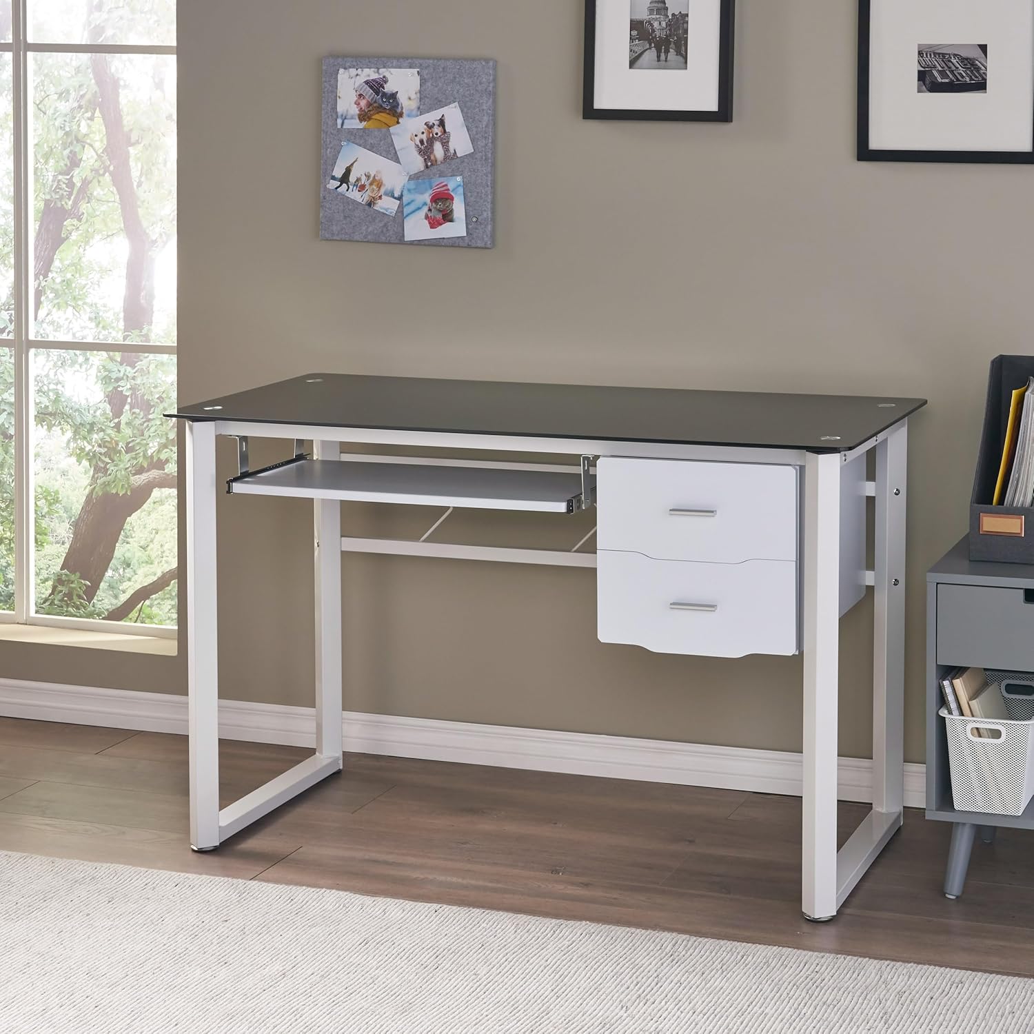 Ultimate Black Tempered Glass Computer Desk with Iron Frame - Stylish Workspace Solution for Your Home Office - includes Sliding Keyboard Tray and 2 Drawers
