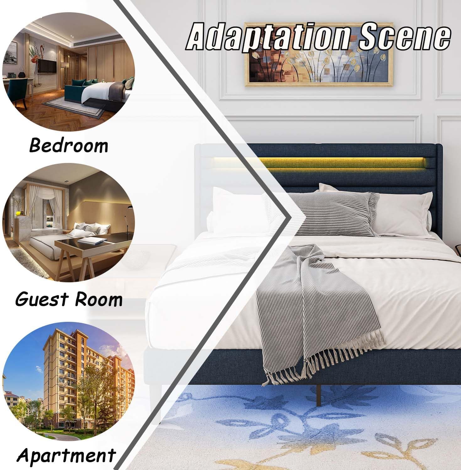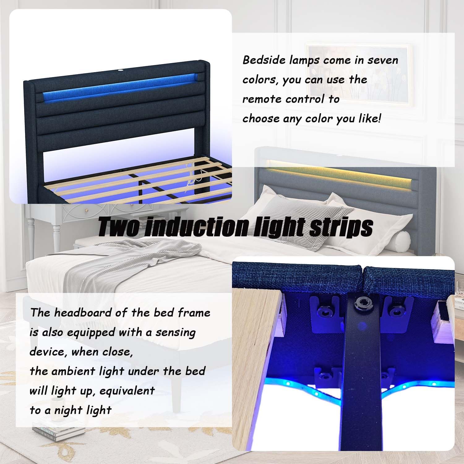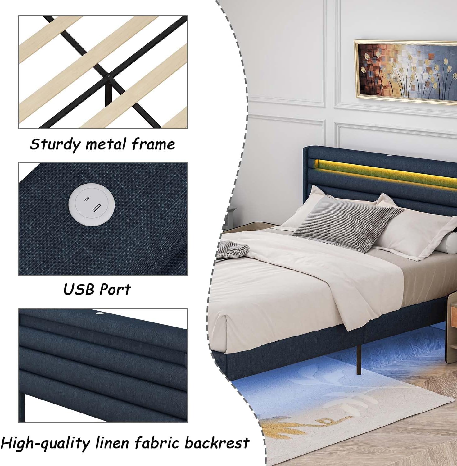Queen Size Metal Platform Bed Frame with Linen Headboard and LED Bedside Induction Light, Industrial Metal Platform Bed with Charging Station and USB Port, No Spring Box Needed, Noise-Free