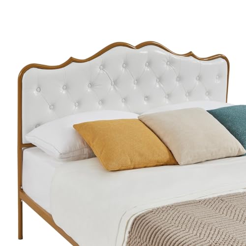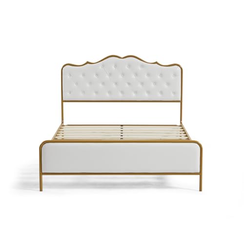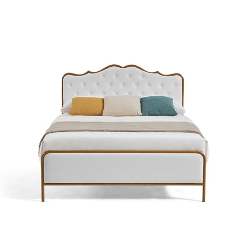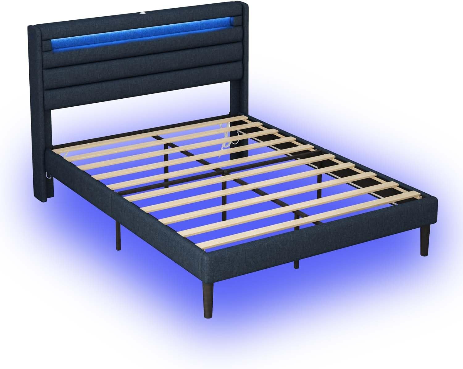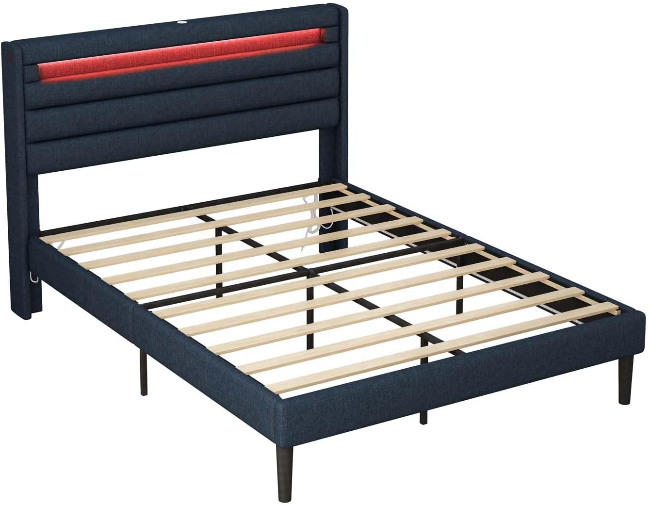 Queen Size Metal Platform Bed Frame with Linen Headboard and LED Bedside Induction Light, Industrial Metal Platform Bed with Charging Station and USB Port, No Spring Box Needed, Noise-Free