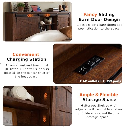 T4TREAM Farmhouse Full Size Bed Frame w/Storage Bookcase Headboard, Sliding Barn Door, Charging Station, Rustic Wood Platform Bed w/Wood Slats Support, No Box Spring Needed, Reclaimed Barnwood Color