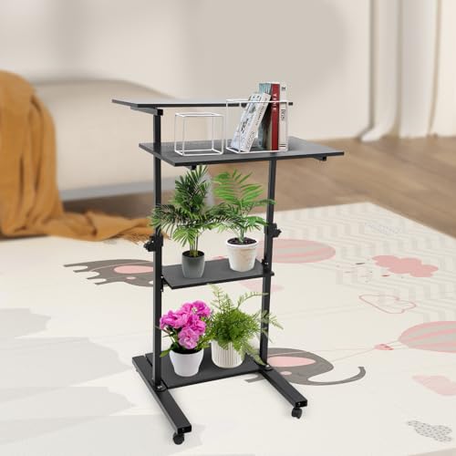 Mobile Standing Desk with Lockable Wheels, Height Adjustable Rolling Stand Up Desk Laptop Cart with 4 Countertops Workstation for Office, Home (Black)
