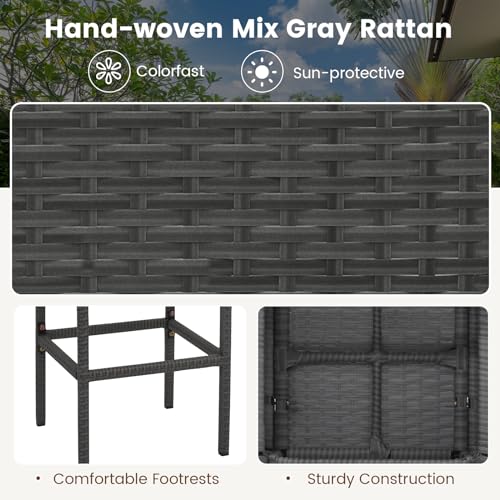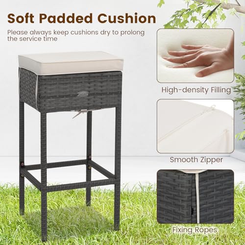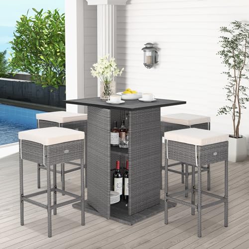 Tangkula 5 Piece Outdoor Rattan Bar Set, Patio Bar Furniture with 4 Cushions Stools and Smooth Top Table with Hidden Storage Shelf, Outdoor Conversation Set for Poolside, Backyard, Lawn (Grey-White)