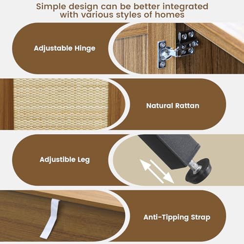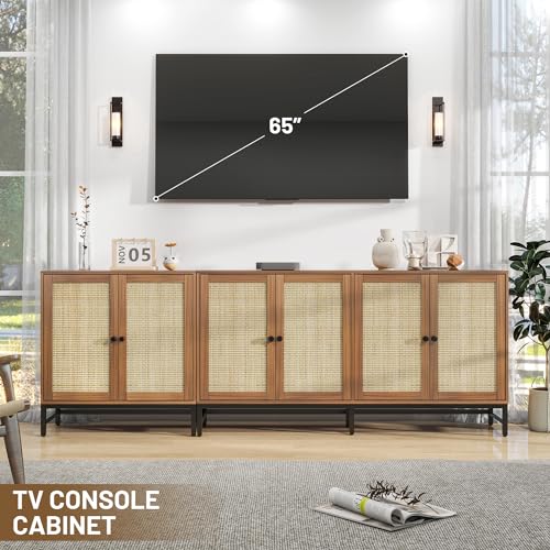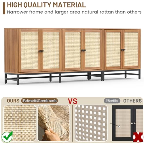 Credenza Rattan Buffet Cabinet, Sideboard Storage Accent Cabinet with 6 Wicker Doors, 90.5" Large Mid Century Modern Console Cabinet for Kitchen, Living Room and Dining Room, Natural