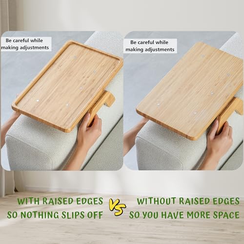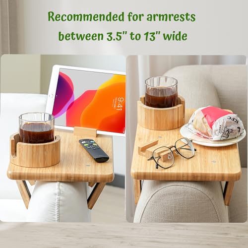 Bamboo Couch Arm Tray, TV Dinner Tray for Sofa Loveseats with Cup Holder Phone Tablet Holder, Clip on Armrest Side End Table Replacement for Meal Drink Remote Glasses, with Raised Edges