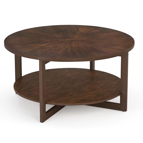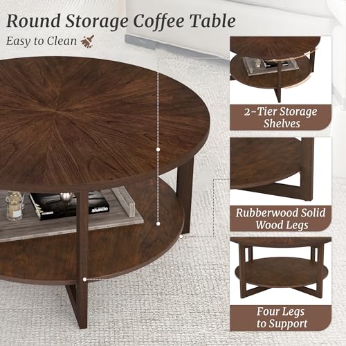 Round Coffee Table, 35" Rustic Modern Circle Coffee Tables with 2-Tier Storage Shelf, Sofa Table, Cocktail Table for Living Room, Dark Brown