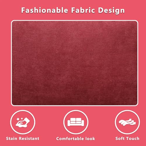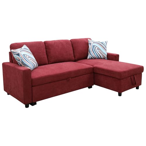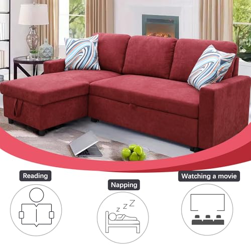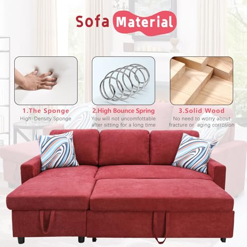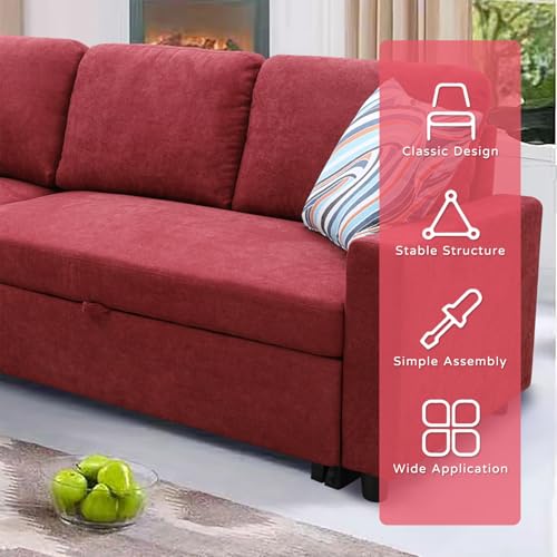 Cotton and Linen L-Shaped Reversible Sleeper Sectional Sofa with Pull-Out Bed - 83" Upholstered Convertible Corner Sofabed for Living Room、Apartment (Red)