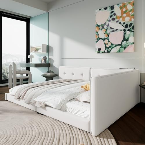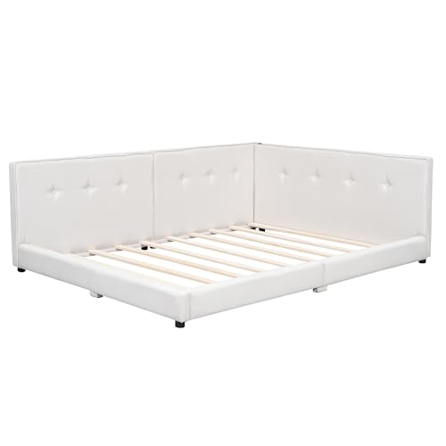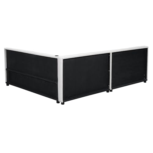 SOFTSEA Full Size Upholstered Floor Daybed, Modern L-Shaped Daybed Corner Bed with USB Ports, Linen Corner Sofa Bed Frame with Tufted Backrest for Kids Teens Adults, Beige