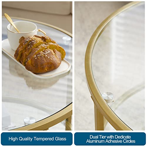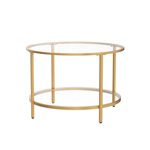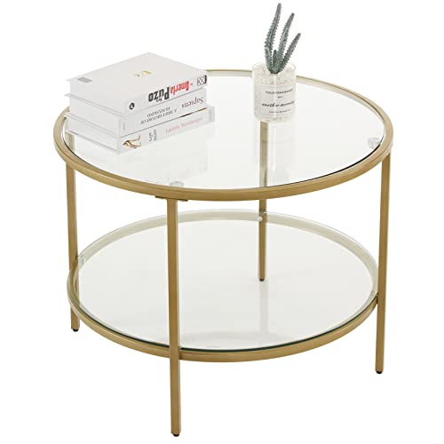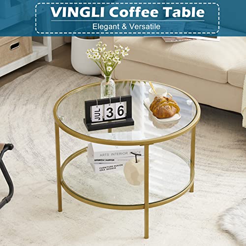 VINGLI 30" Rattan Coffee Table, Round Water-wave Glass Metal Center Table, Modern Coffee Tbale with 2-Tier Storage, Farmhouse Circular Coffee table for Living Room and Small Space, Natural Vibe