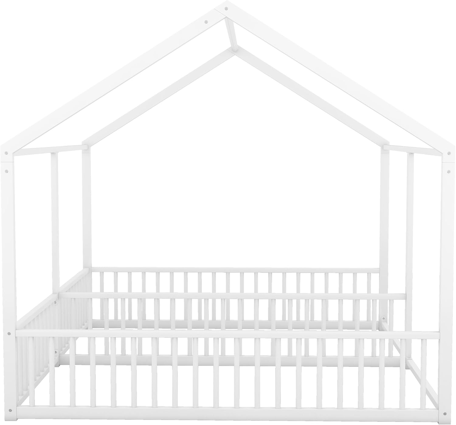 Twin Size Double Platform Bed with Roof & Fence for Kids Bedroom,Sturdy Steel House Shaped Floor Bedframe,No Box Spring Needed & Super Save Spave, White