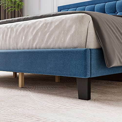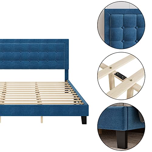 Queen Size Bed Frame with Button Tufted Headboard, Upholstered Low Platform Bed Frame, Wooden Slat Support, Noise Free, No Box Spring Needed, Easy Assembly, Light Gray