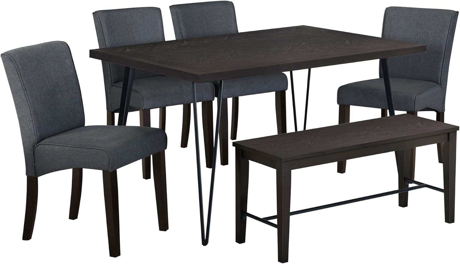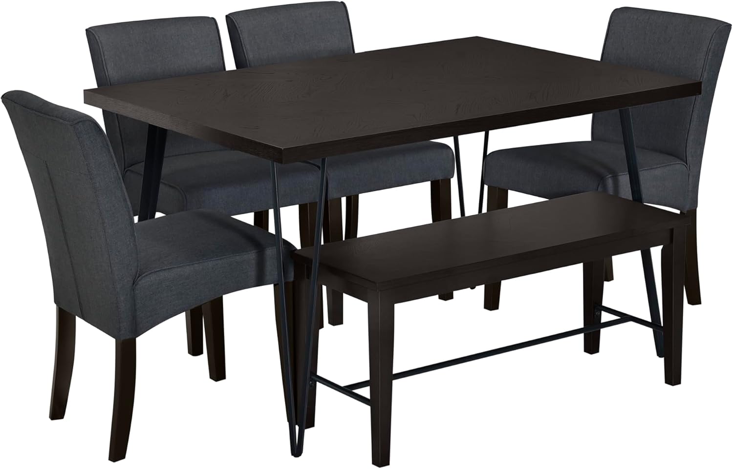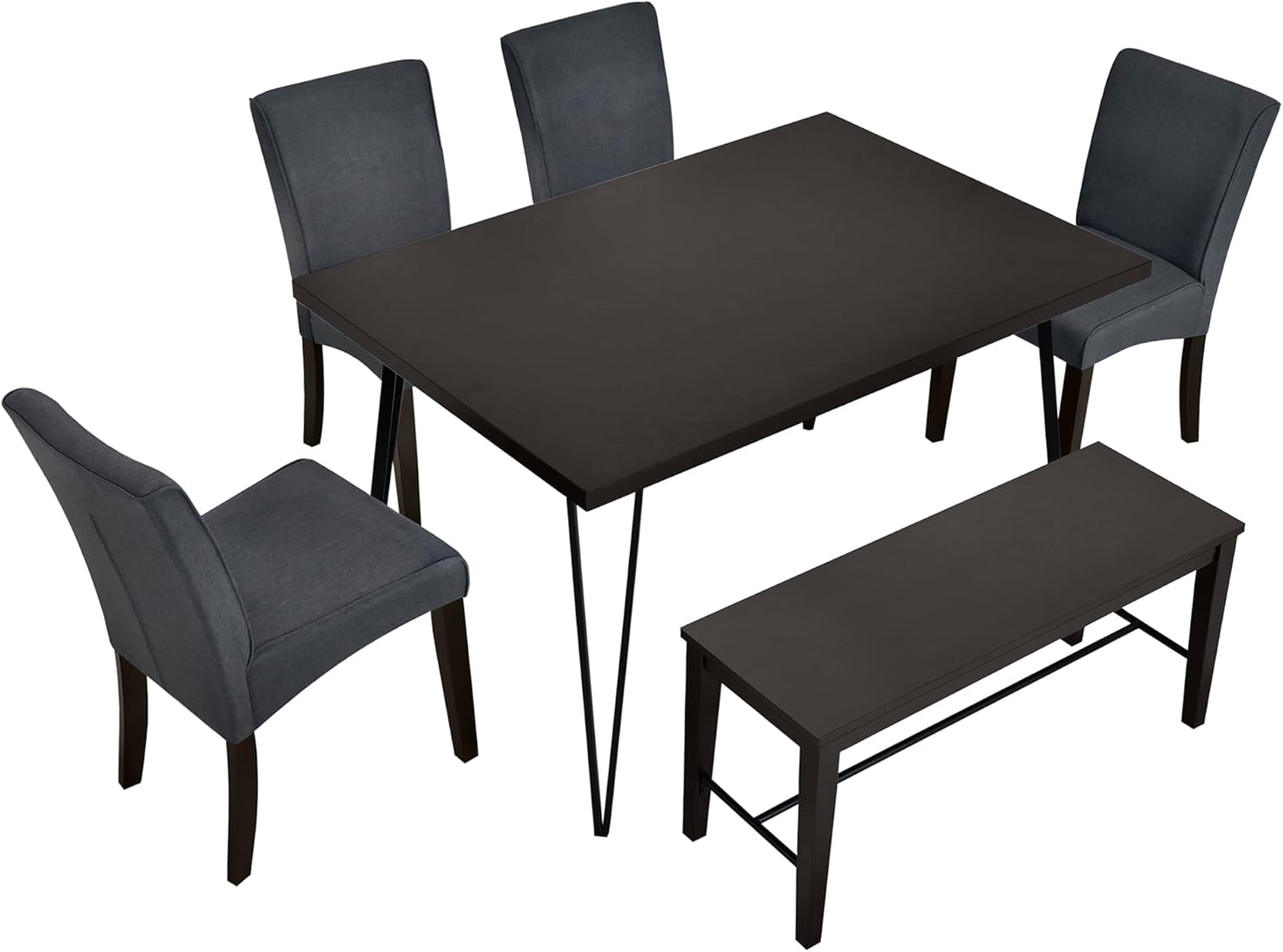 Rectangular Modern 6-Piece Dining Table Set for 6 with V-Shape Metal Legs,4 Upholstered Chairs and Bench, Espresso