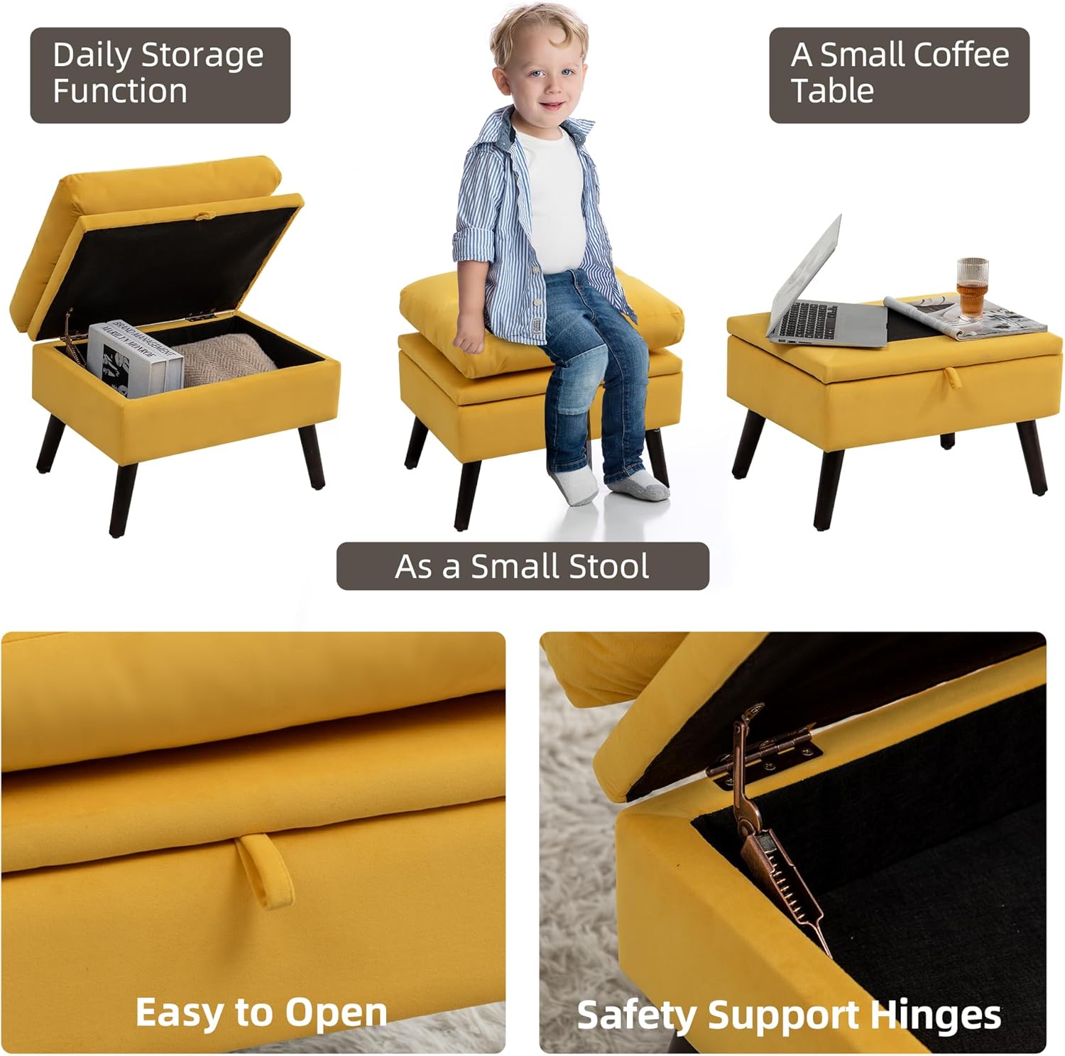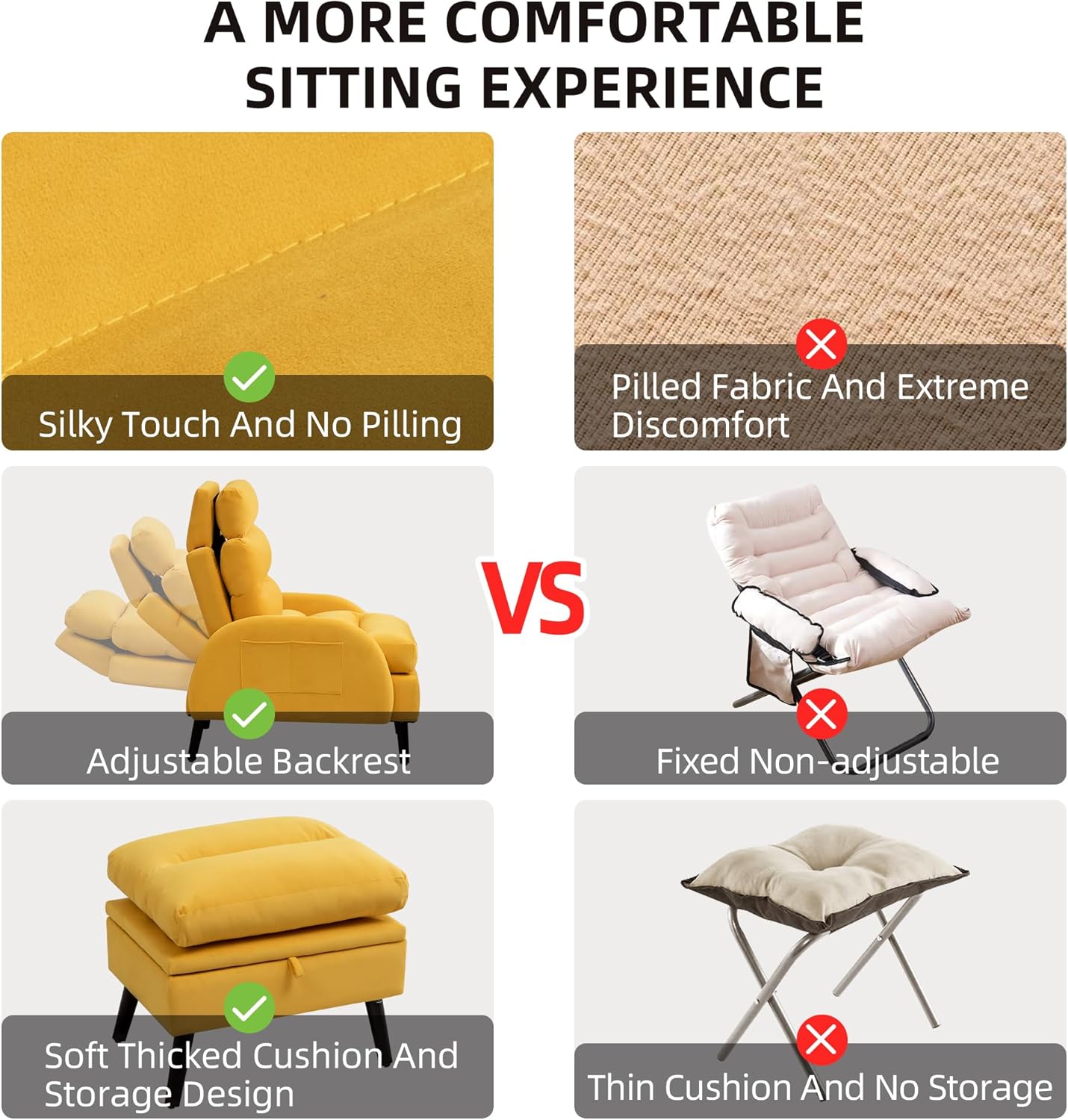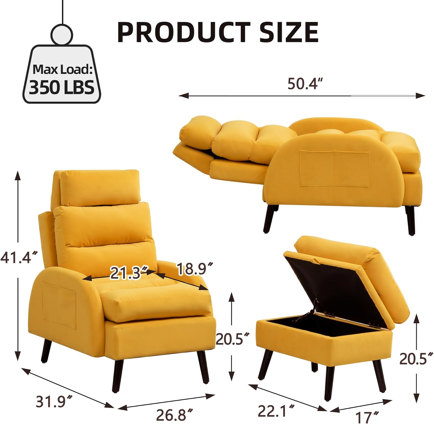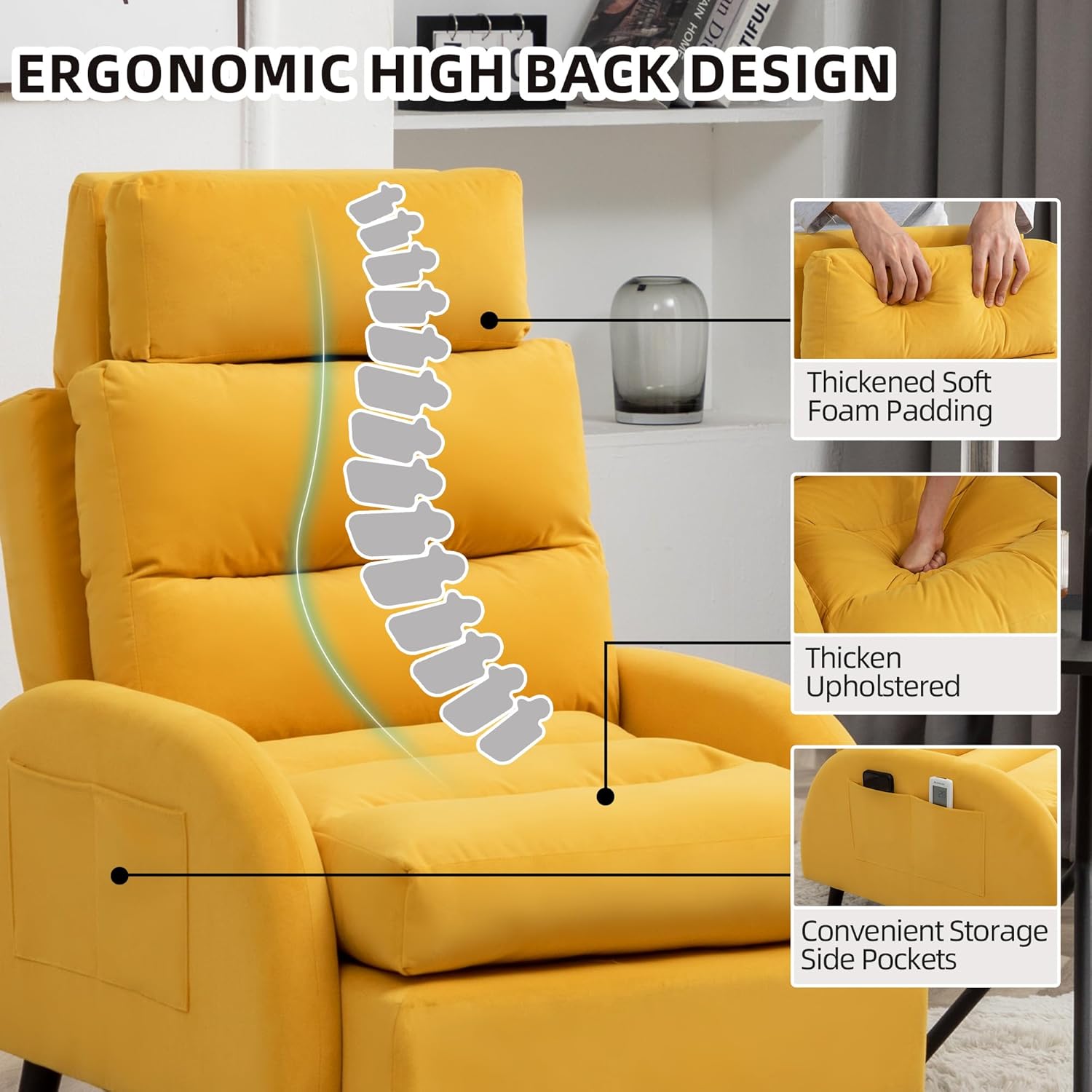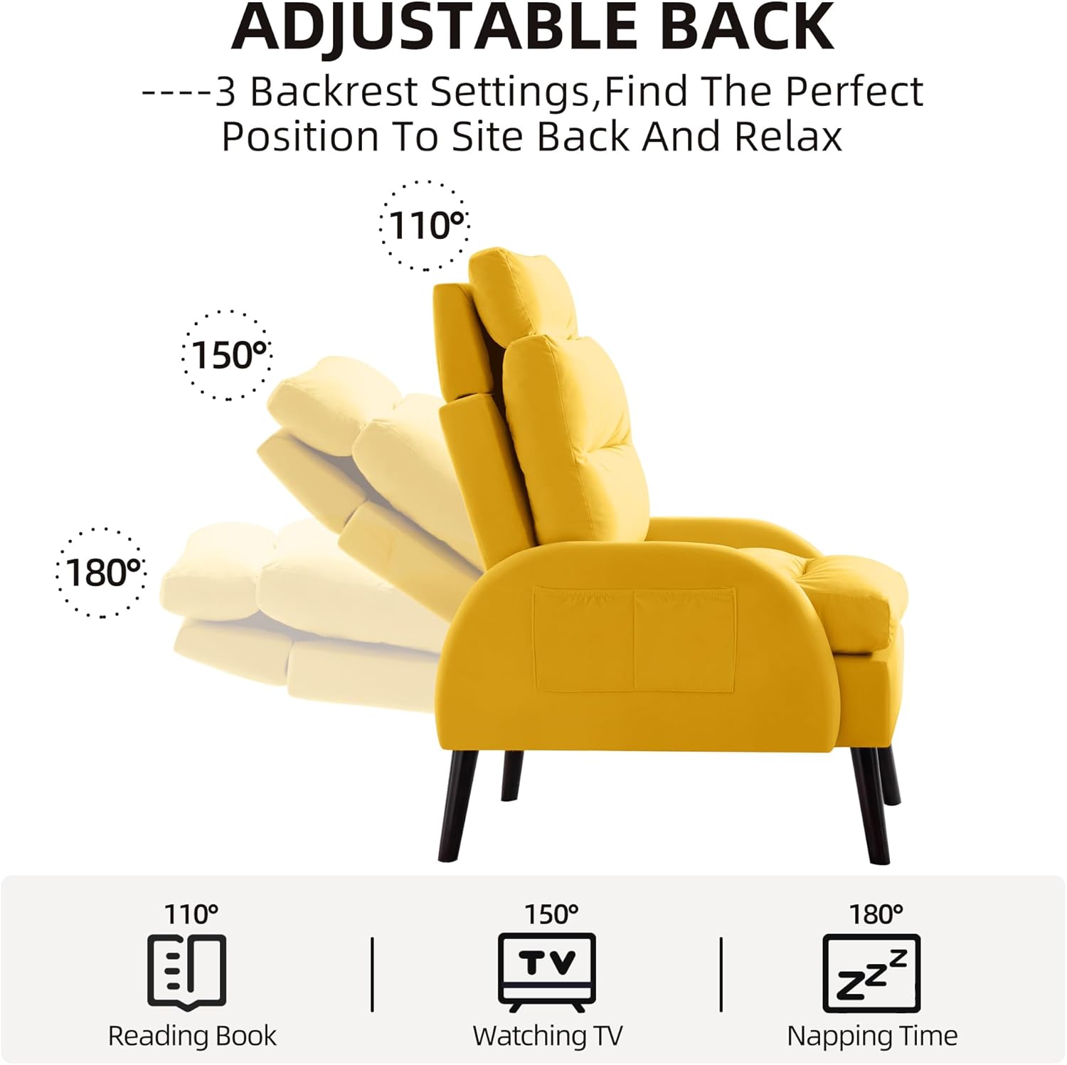 Accent Chair with Ottoman Set, Velvet Reclining Armchair with Adjustable Backrest, Comfy Loung Chair with Side Pocket for Living Room Bedroom Reading Room, Yellow