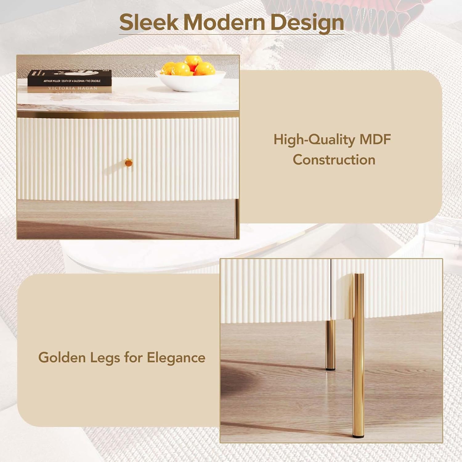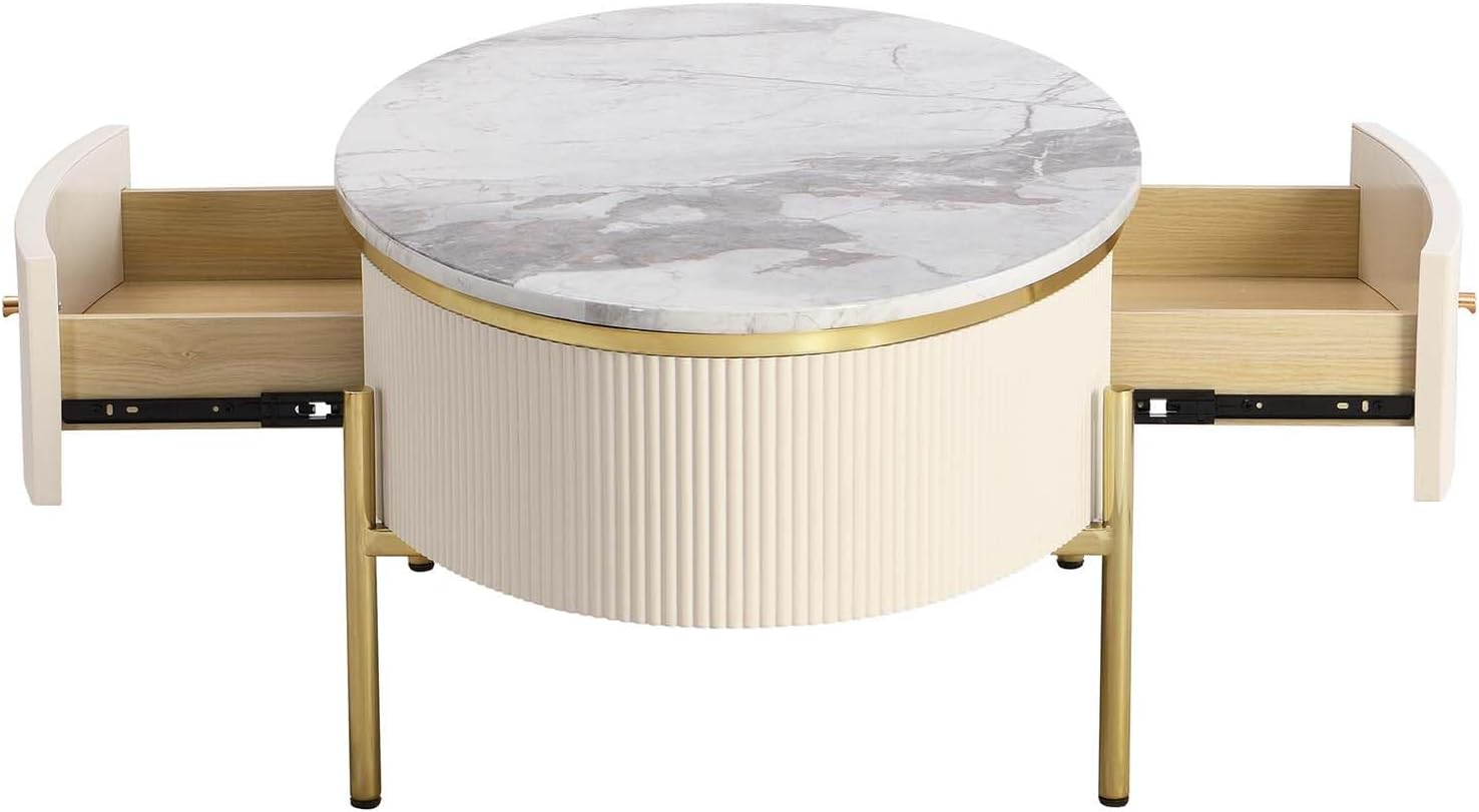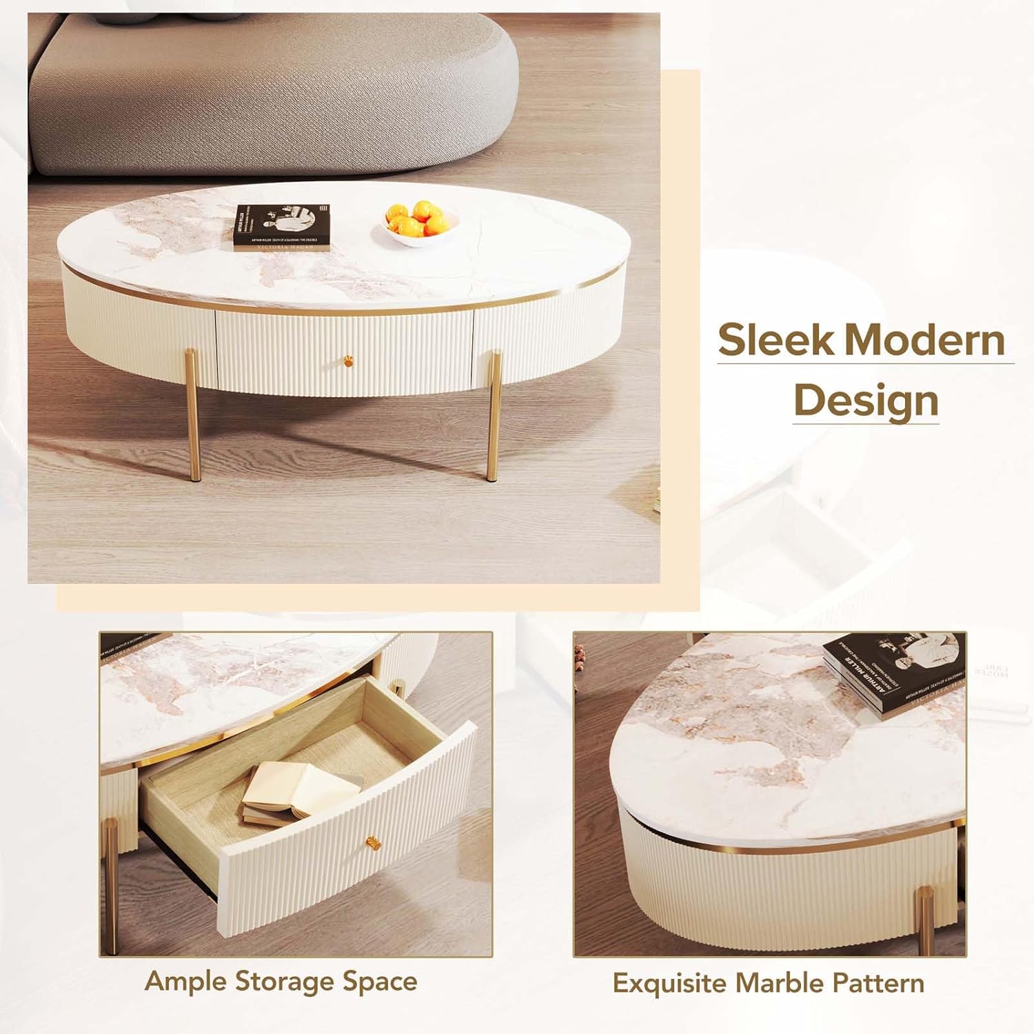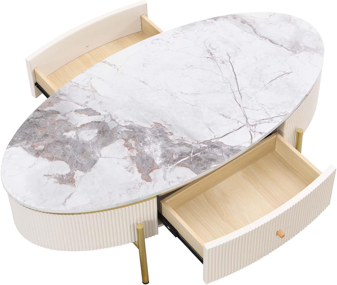 Oval Coffee Table with 2 Large Drawers, Modern Coffee Table with Faux Marble Table Top, Accent Center Table with Gold Legs for Living Room, White
