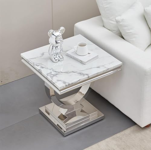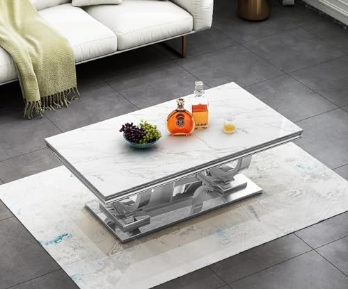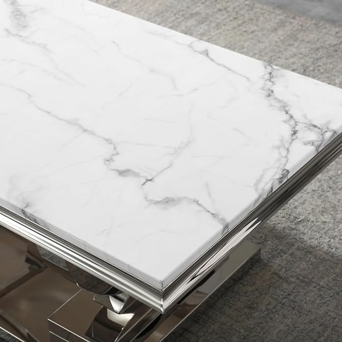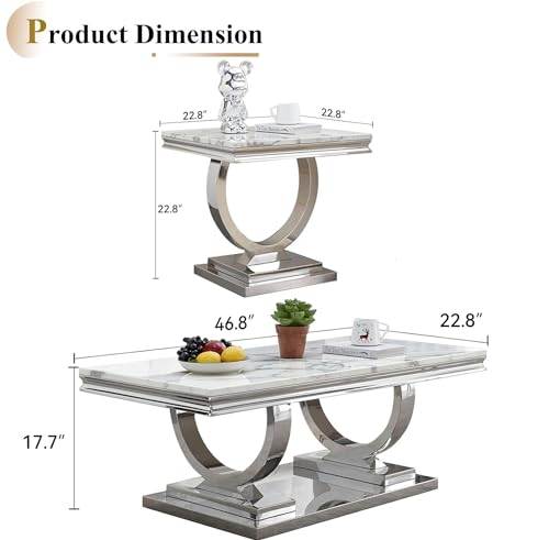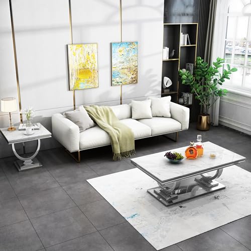 2 Piece Living Room Table Set, Faux Marble Coffee Table and Silver Console Table, Rectangular Luxury White and Silver Coffee Table Set of 2 with Stainless Steel Legs for Apartment Bedroom
