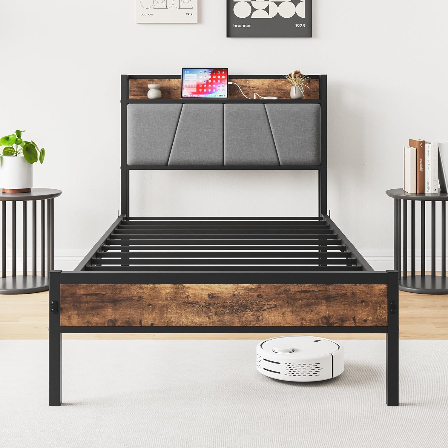 Metal Bed Frame Twin Size with Storage Wooden Headboard/USB Charging Station,Heavy Duty Metal Platform Bed Frames W/Mattress Foundation Firm Steel Slat Support, No Box Spring Needed
