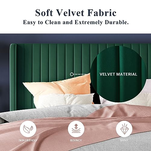 Allewie Queen Size Bed Frame/Velvet Upholstered Platform Bed/Vertical Channel Tufted Wingback Headboard/Strong Wooden Slats/No Box Spring Needed/Easy Assembly/Green