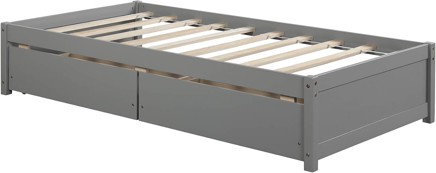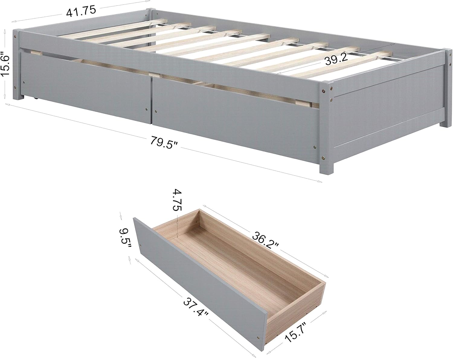 Twin Bed with 2 Drawers, Solid Wood, No Box Spring Needed, Grey