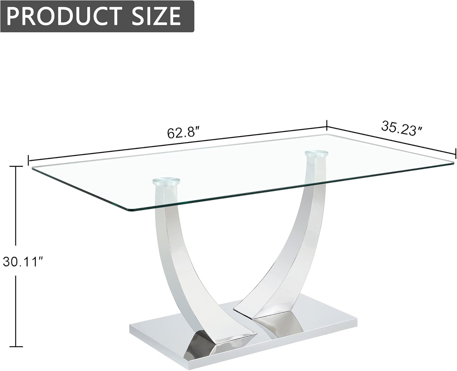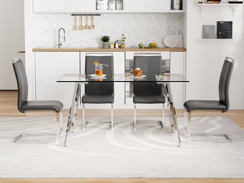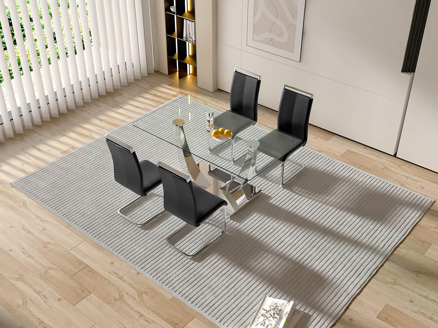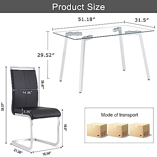 62.8" Rectangular Glass Dining Table for 4-6 with 4 Dining Chairs, 0.39" Tempered Glass and Silver Chrome Metal Special-Shaped Bracket, for Kitchen Dining Room Living Room, 5 Piece Dining Set(Black)