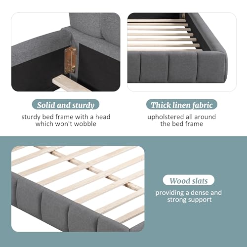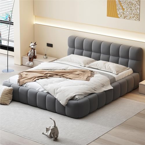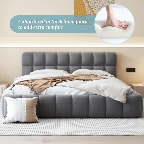Merax Queen Size Upholstered Platform Bed, Platform Bed with Thick Fabric, Grounded Bed with Solid Frame, Beige