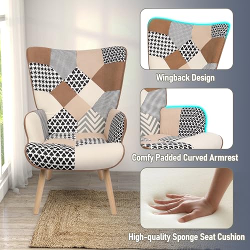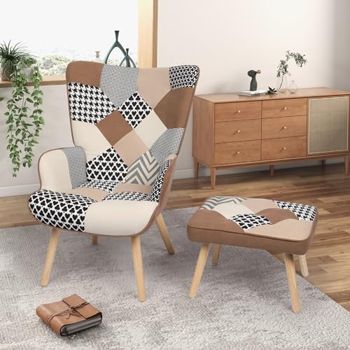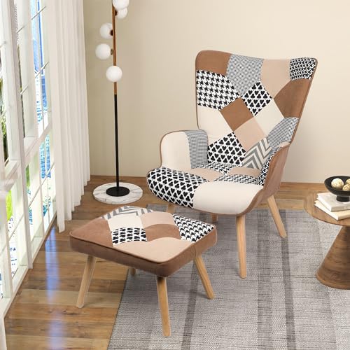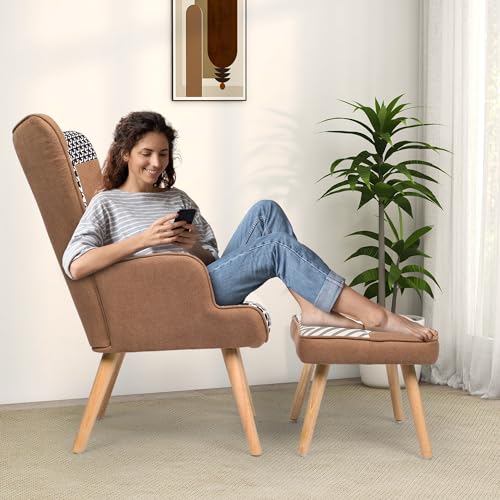 Living Room Accent Chair with Ottoman Set, Modern Reading Armchair, Comfy Chair with High Wingback, Lounge Chair with Solid Wood Legs for Bedroom, Coffee (Colorful)…