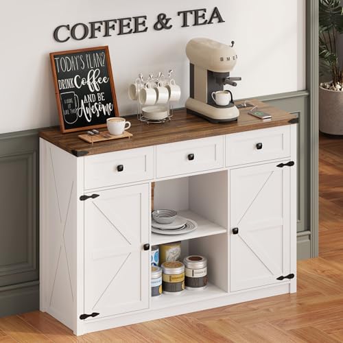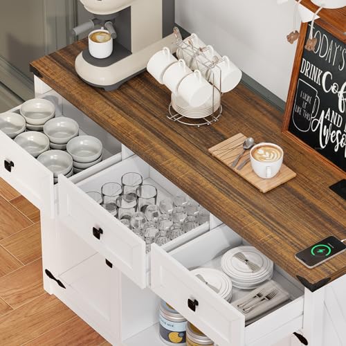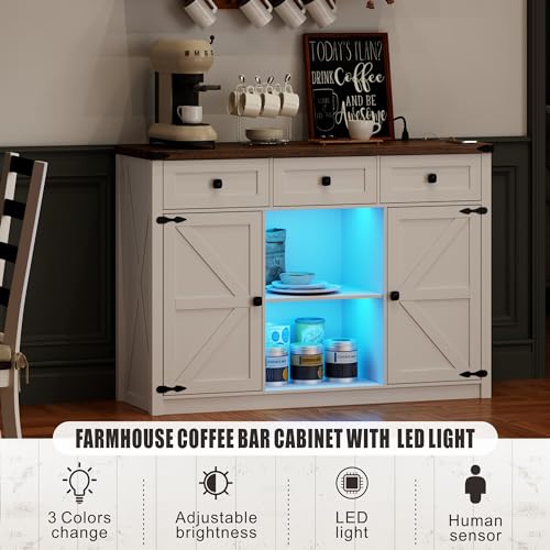 Farmhouse Sideboard Buffet Cabinet with Storage, Large Kitchen Storage Cabinet with 3 Drawers and 2 Doors, Coffee Wine Bar Cabinet with Light and Charging Station for Kitchen, White