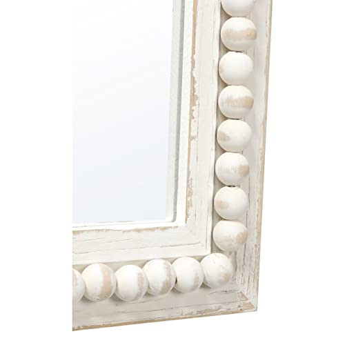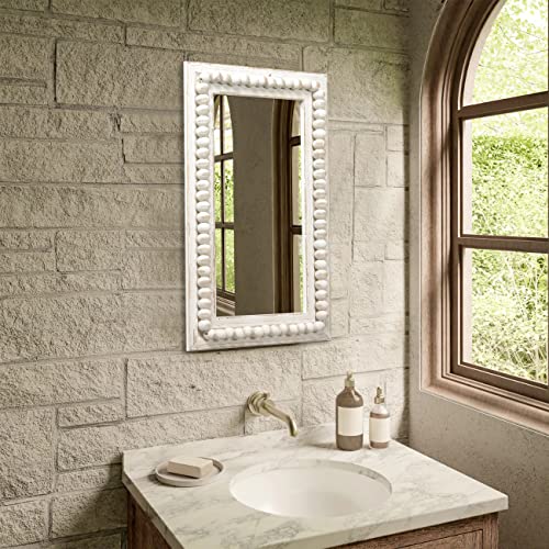 Boho White Mirrors for Wall Decor Living Room 24 x 16 Inches Hanging Rustic Wooden Bedroom Mirror with Beaded Detailing, Vintage Rectangular Bathroom Vanity Mirror Decor