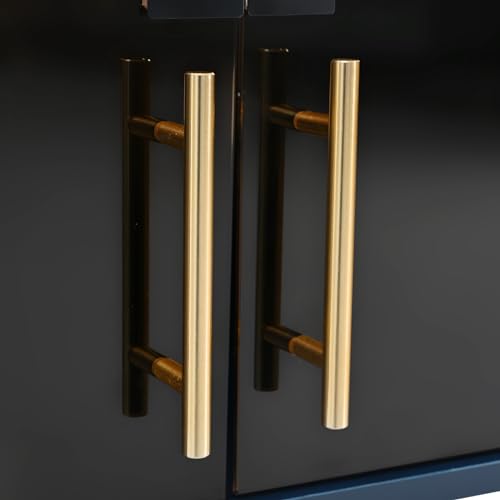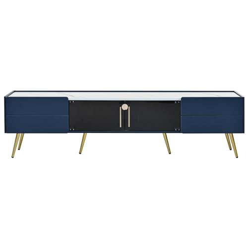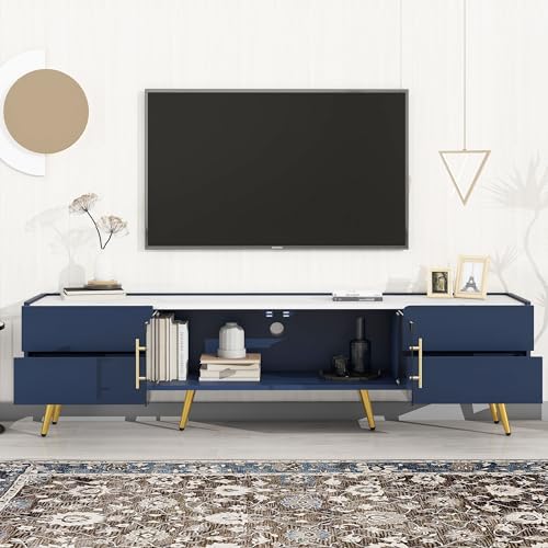 LUMISOL Modern TV Stand with LED Lights for 80'' TV, 70'' Faux Marble Entertainment Center with 4 Drawers and Glass Doors, Wood TV Console Media Cabinet with Gold Legs for Living Room Bedroom (Black)