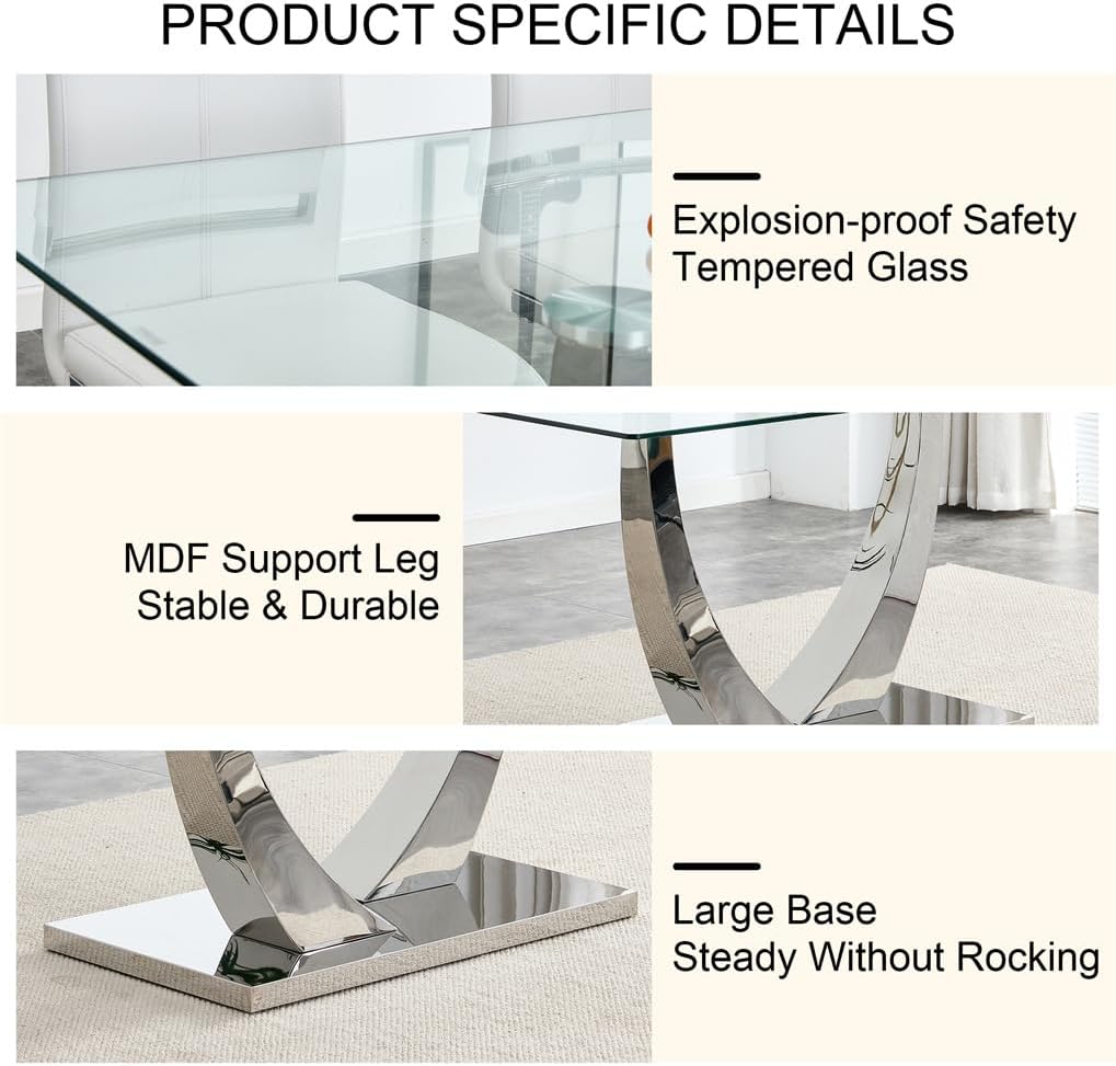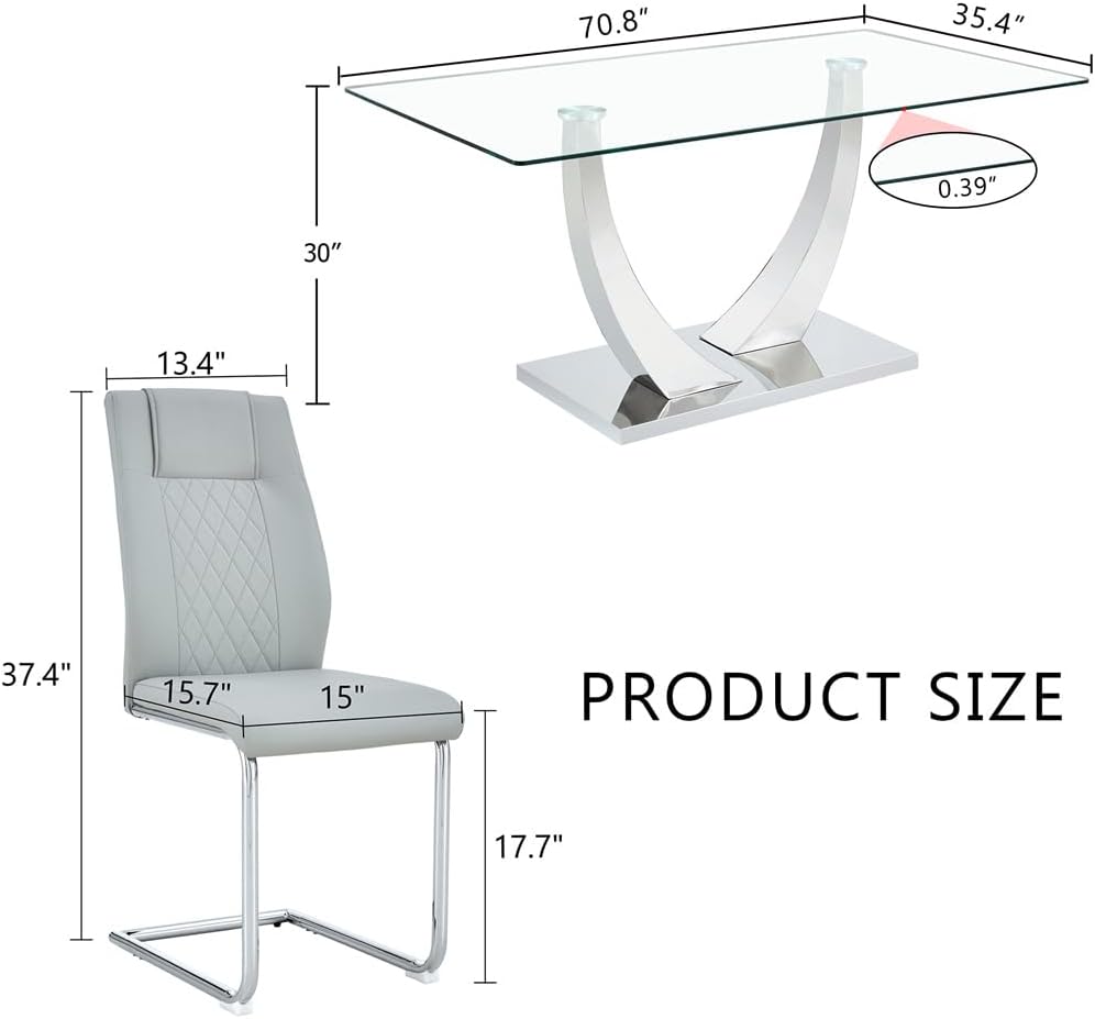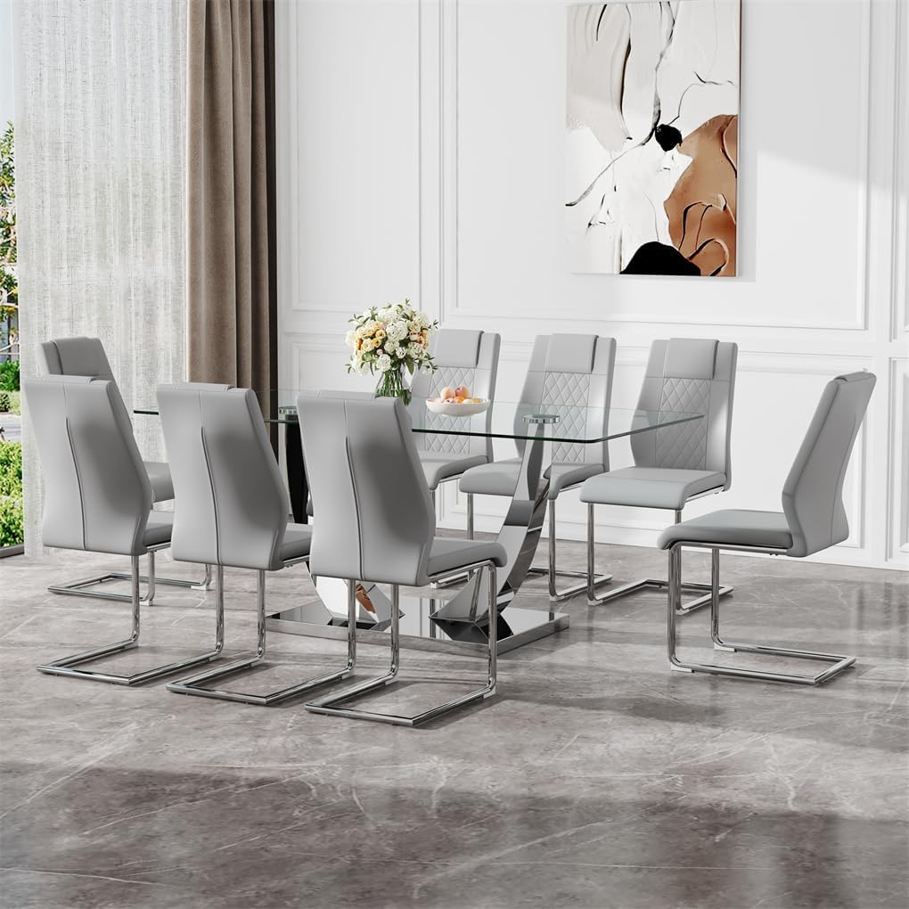 Glass Dining Table Set for 8, 71''Modern Tempered Glass Dining Table Set, 9 Pieces Kitchen Table and PU Cusion Dining Chairs for 8(A Style: Glass Sliver Table + Gray L Chair, 71''Table *8 Chairs)
