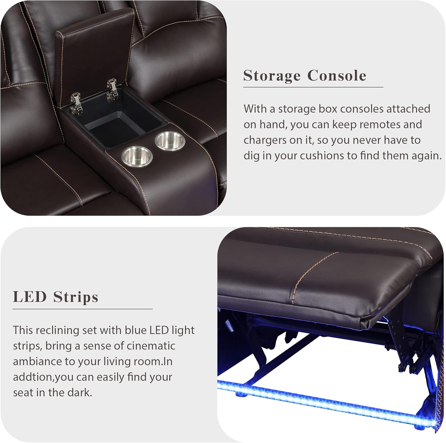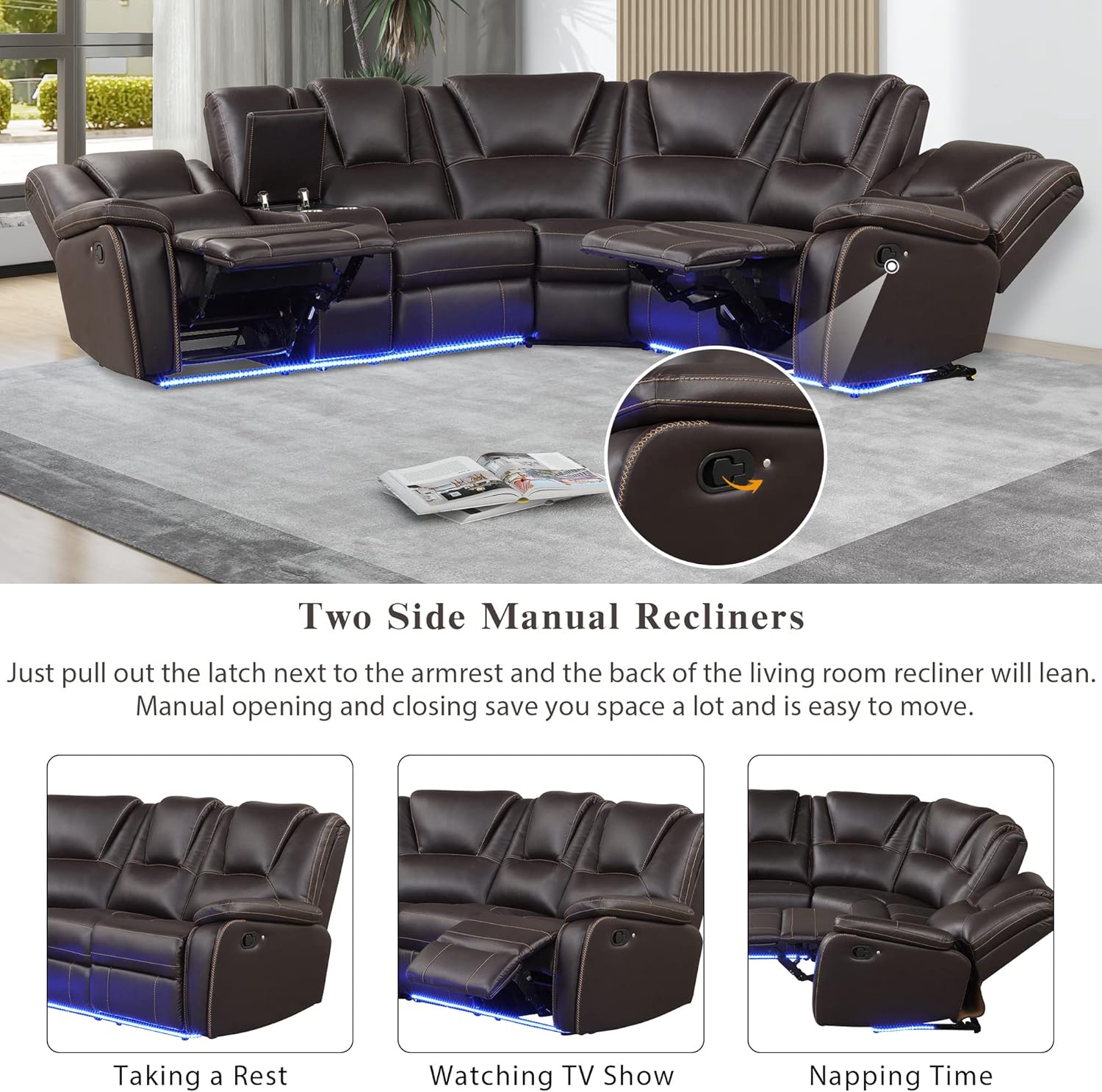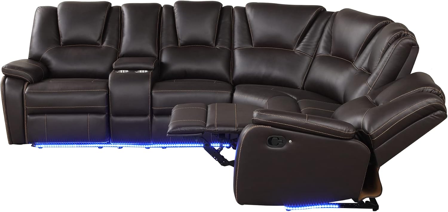 Power Reclining Sectional Sofa Chair Sofa-102 Motion Living Room Corner Cup Holder, Featuring Elegant Black PU Leather, Brown-A