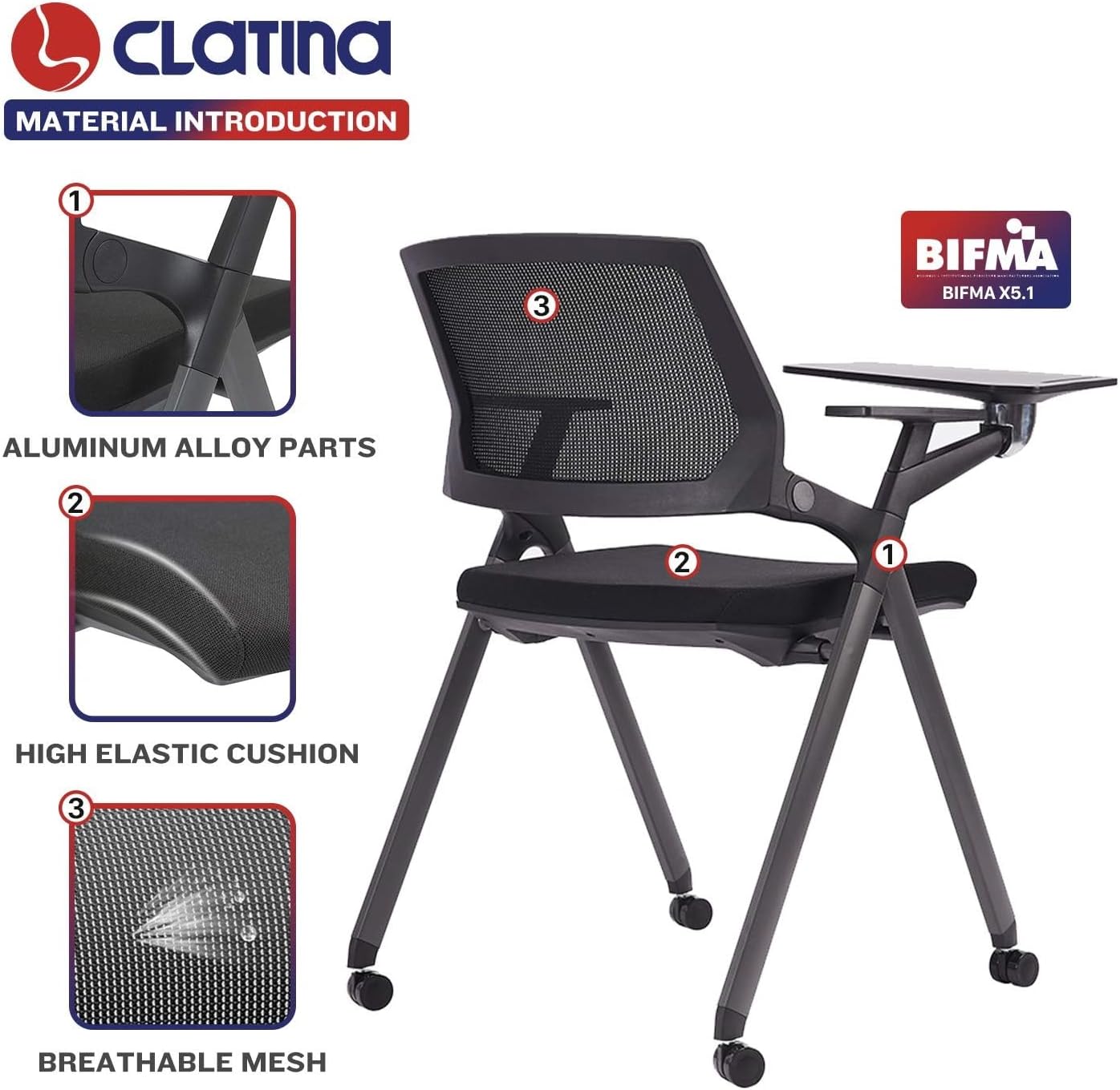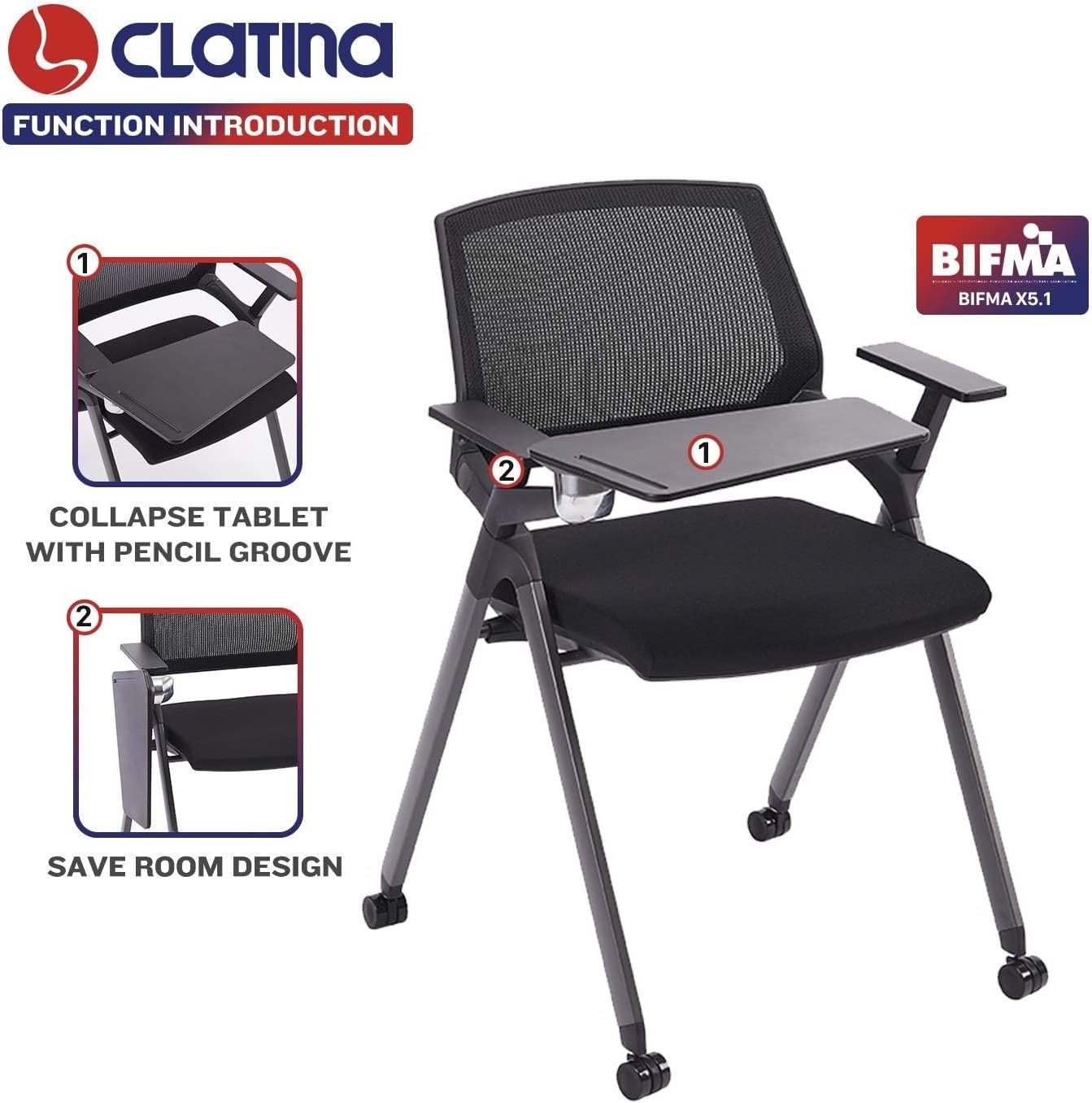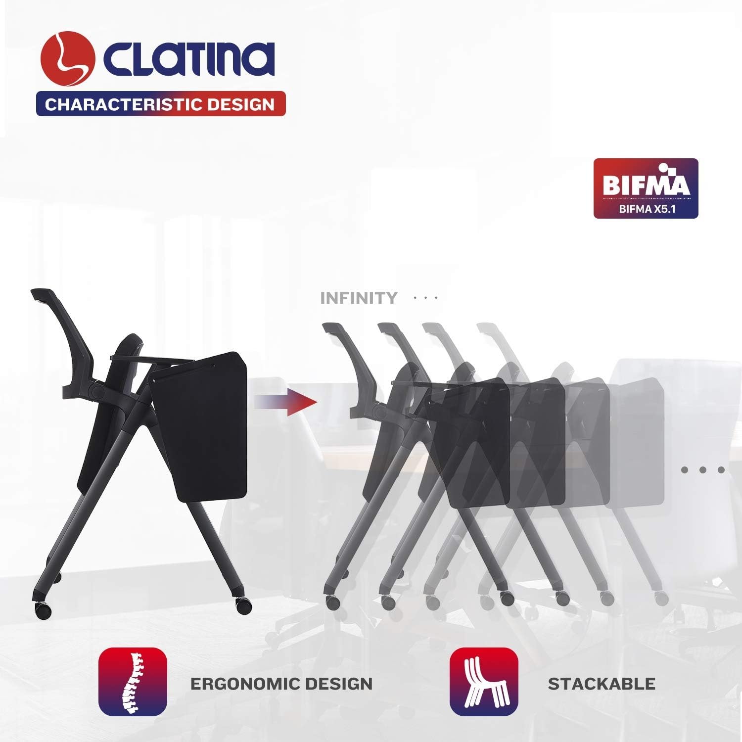 CLATINA Guest Reception Stack Chairs with Caster Wheels,Mesh Back Nesting Chairs with Thickened Fabric Seat,Office School Church Conference Waiting Room Black