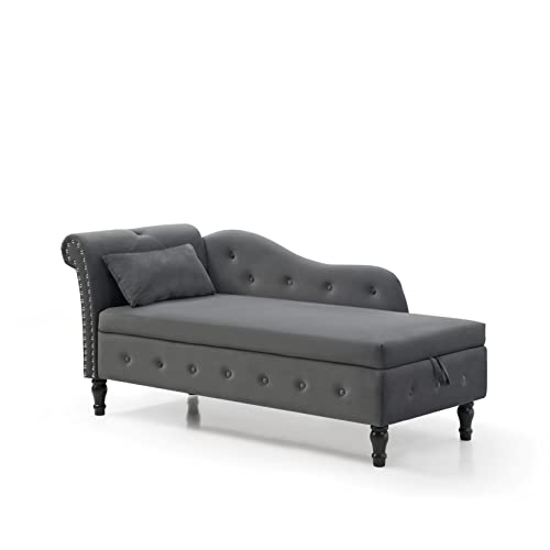 60" Chaise Lounge Indoor with Storage and Pillow, Velvet Upholstered Chaise Chair with Rolled Arm, Button Tufted Nailhead Trimmed Chaise Lounge Chair Indoor Sofa Recliner Couch, Beige