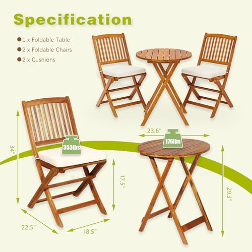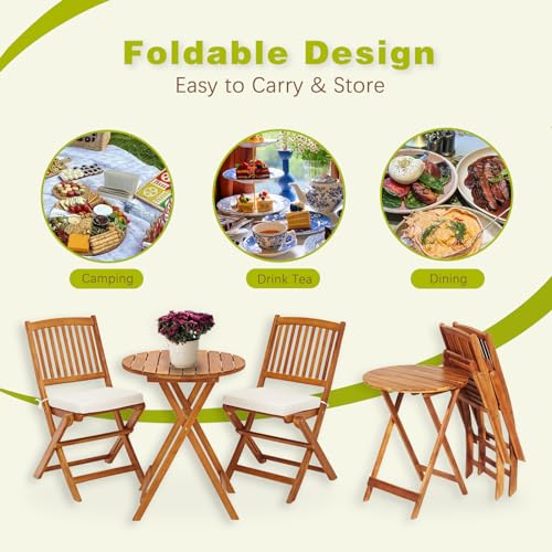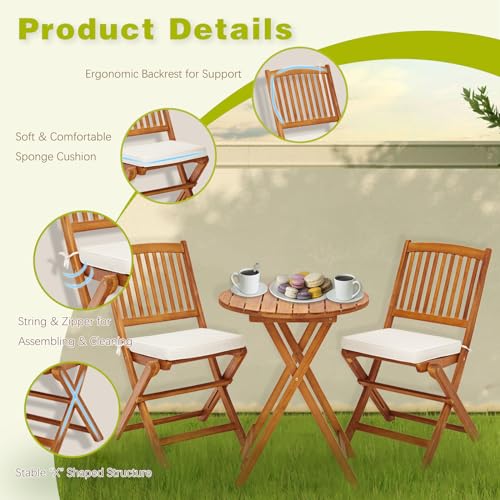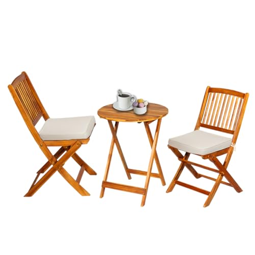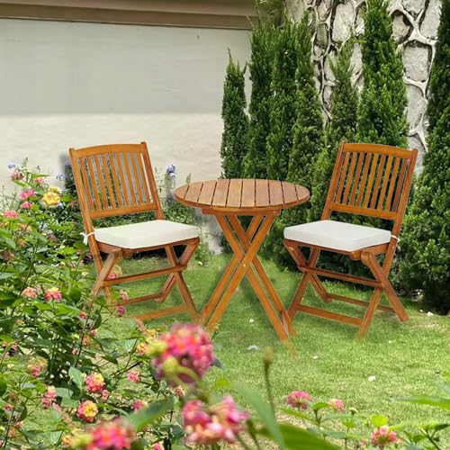 S AFSTAR Bistro Table and Chairs Set of 2, Acacia Wood Folding Bistro Table Chairs Set with Round Coffee Table & Padded Cushion, Small Bistro Table Set for 2 Outdoor Porch Patio Poolside Balcony (Red)