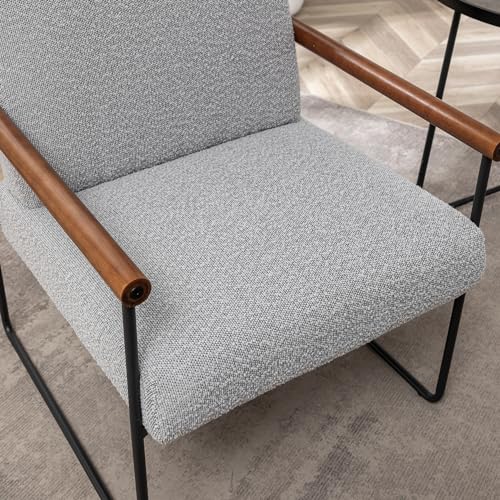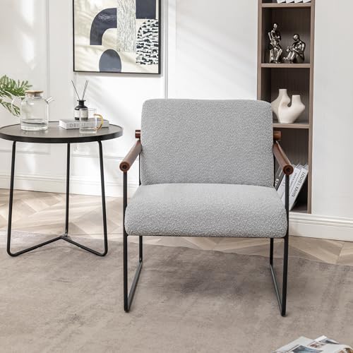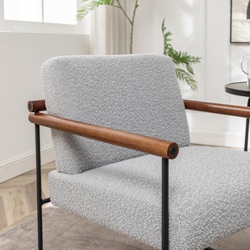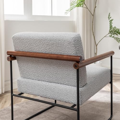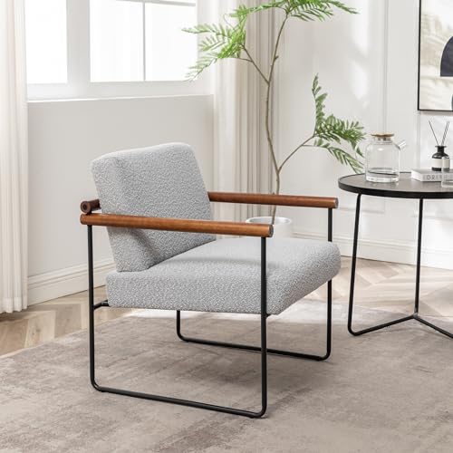Boucle Accent Chair with Round Wood Arms, Comfy Upholstered Arm Chair with Metal Frames, Mid Century Modern Chair for Living Room, Bedroom, Beige