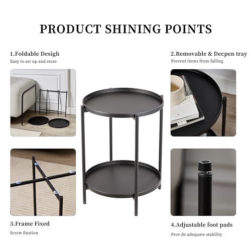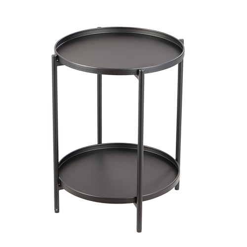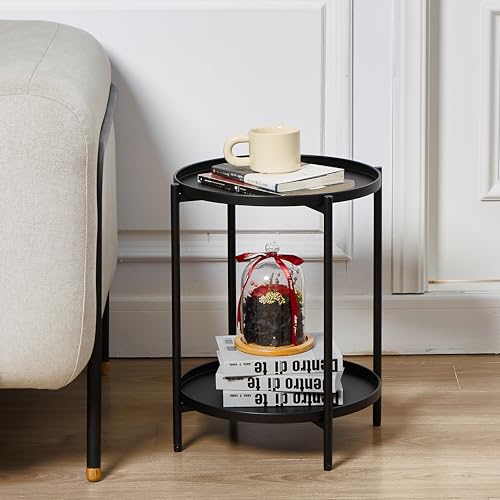 2 Tier Round Side Table, Marble End Tables Coffee Table Simplistic Sofa Table Waterproof Removable Tray Table Indoor Outdoor Accent Table for Living Room Bedroom (Faux Marble Black, 2pcs)