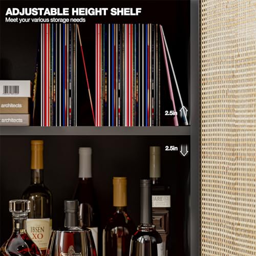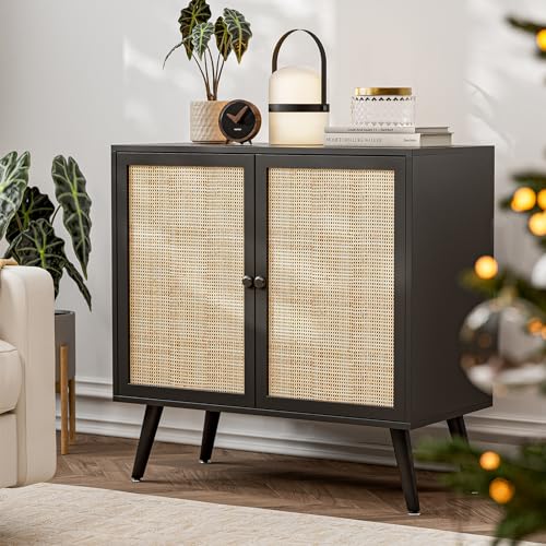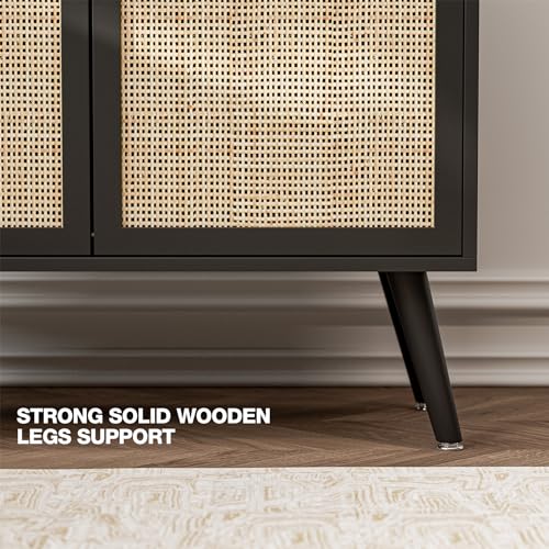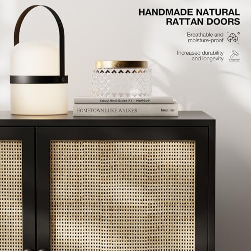 IKIFLY Black Rattan Sideboard Buffet Cabinet with 2 Handmade Natural Rattan Doors, Accent Storage Cabinet for Living Room, Hallway, Entryway, Kitchen