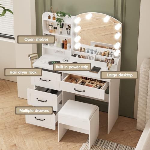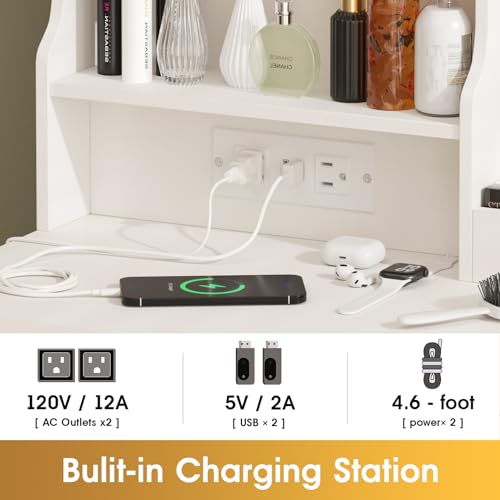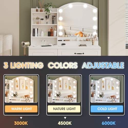 White Vanity Desk with Mirror,- Large Makeup Table Set with 4 Drawers Lots Storage ,3 Color Lighting Modes with Adjustable Brightness