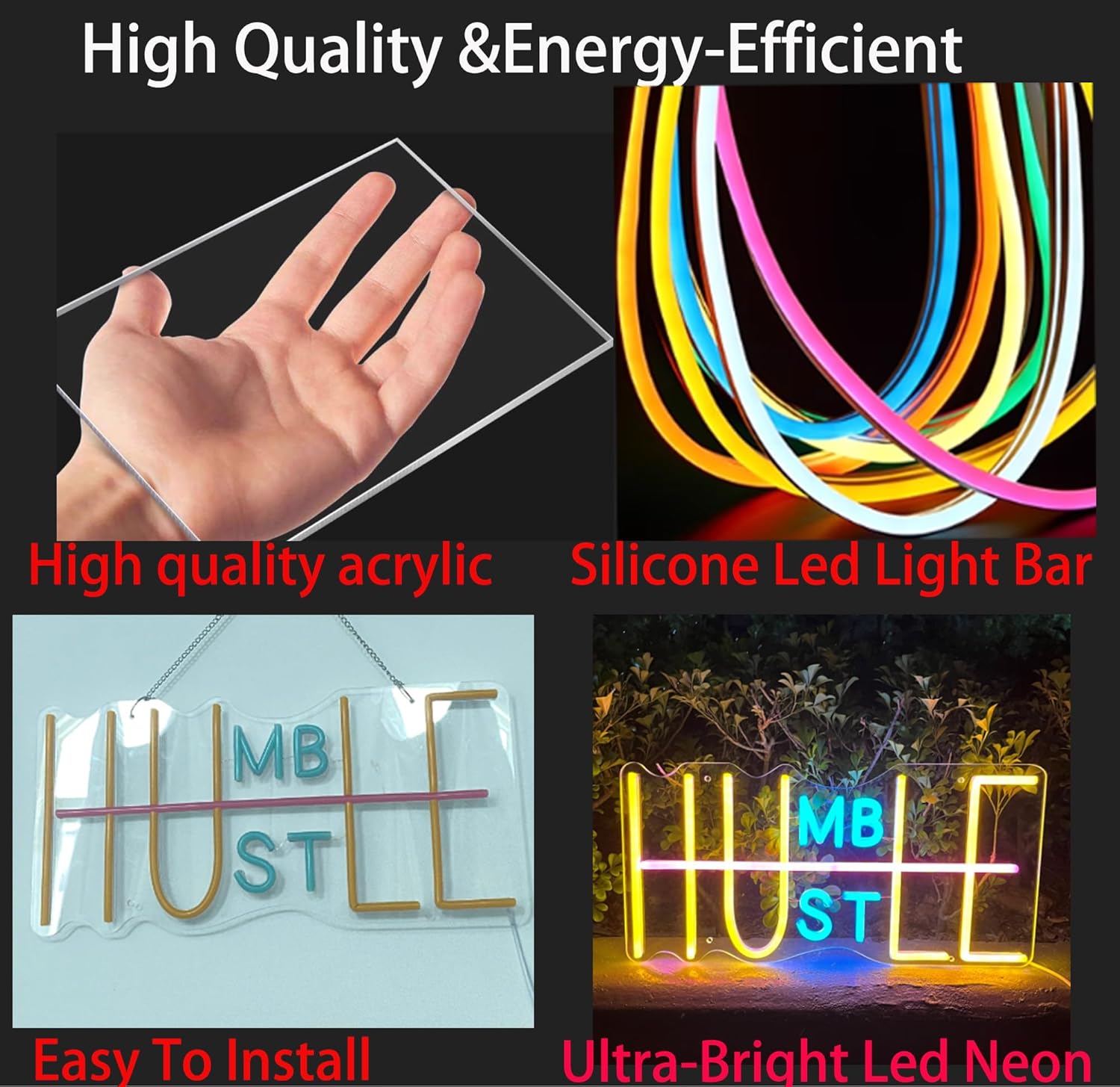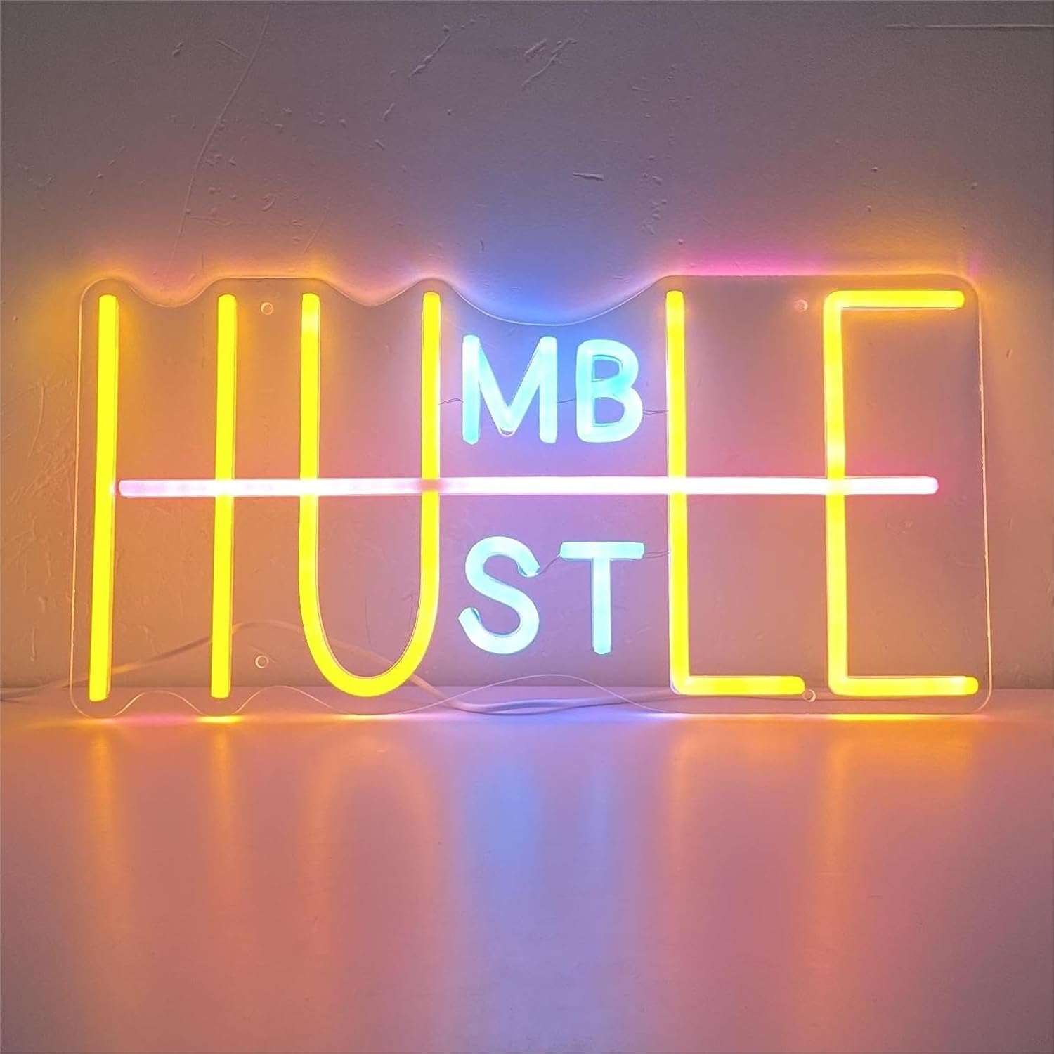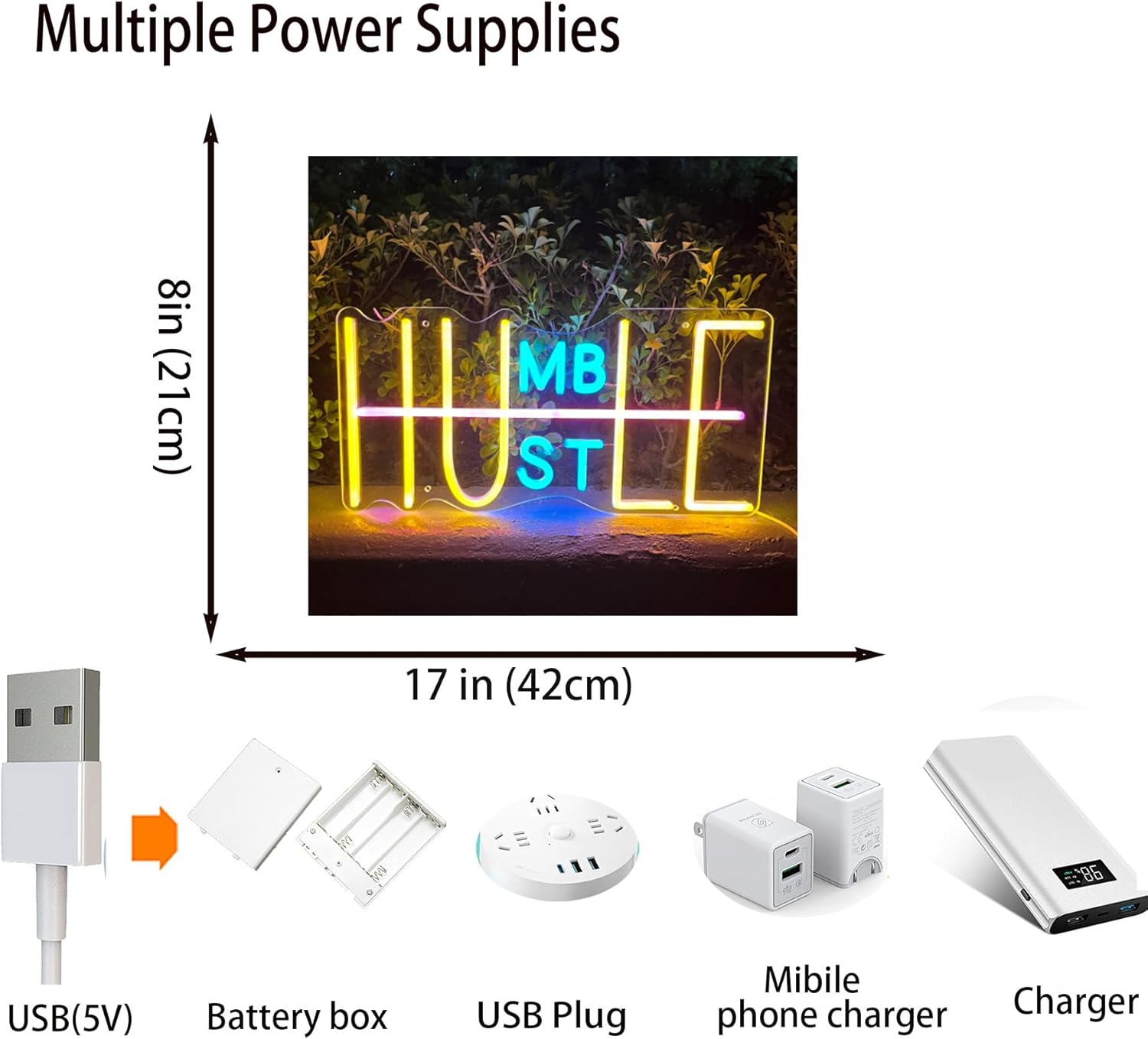 Hustle Neon Sign,LED Humble Neon Signs for Wall Decor,Light Up Signs for Office Room Bedroom Game Room Party Club Decor,Battery Box or USB Powered(Orange + Ice Blue)