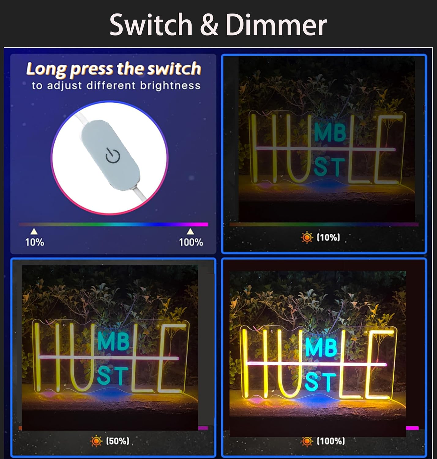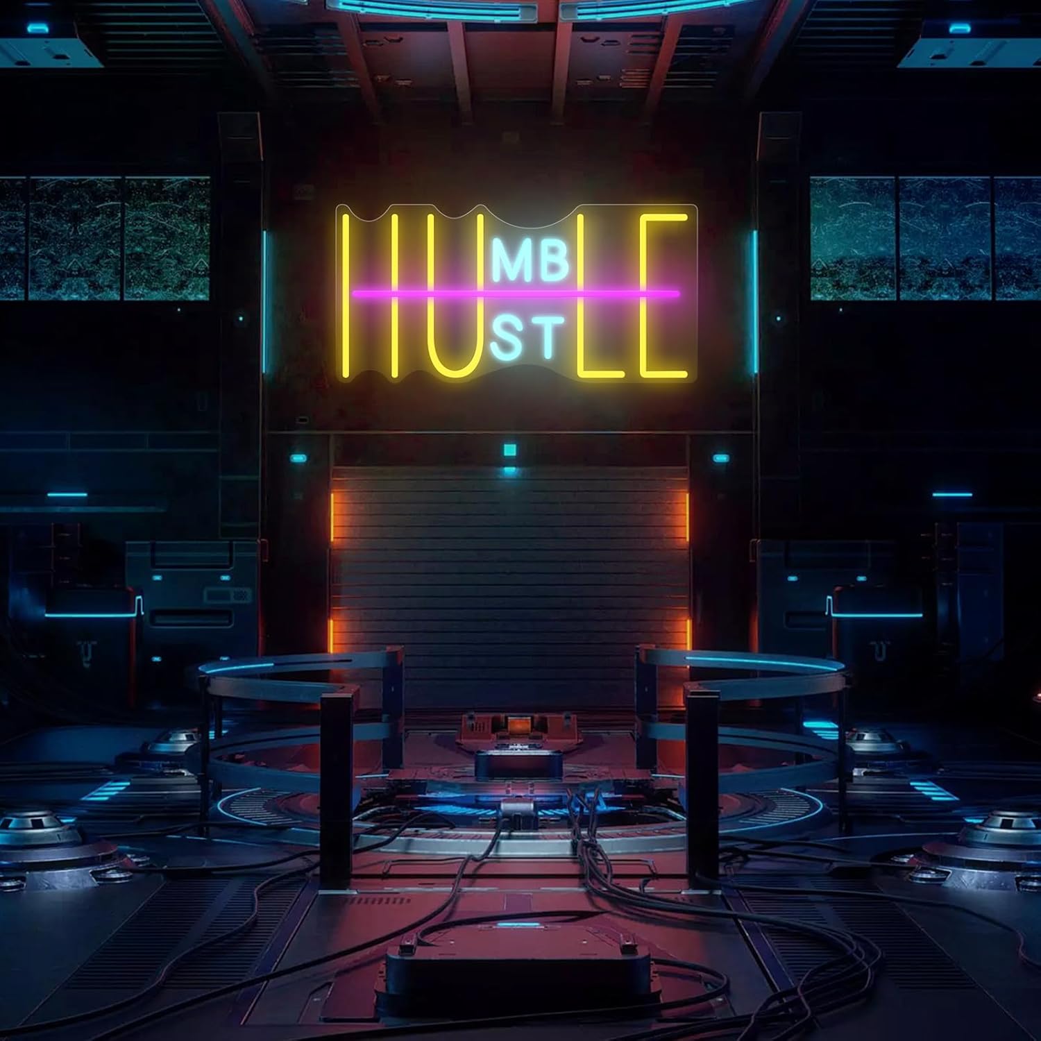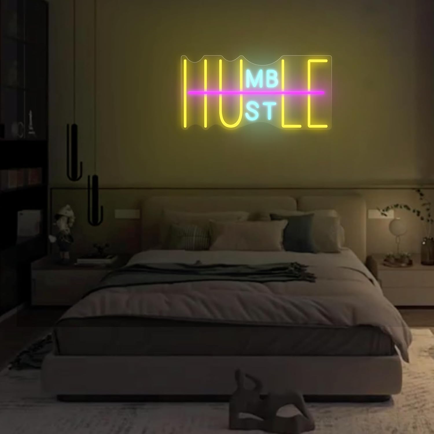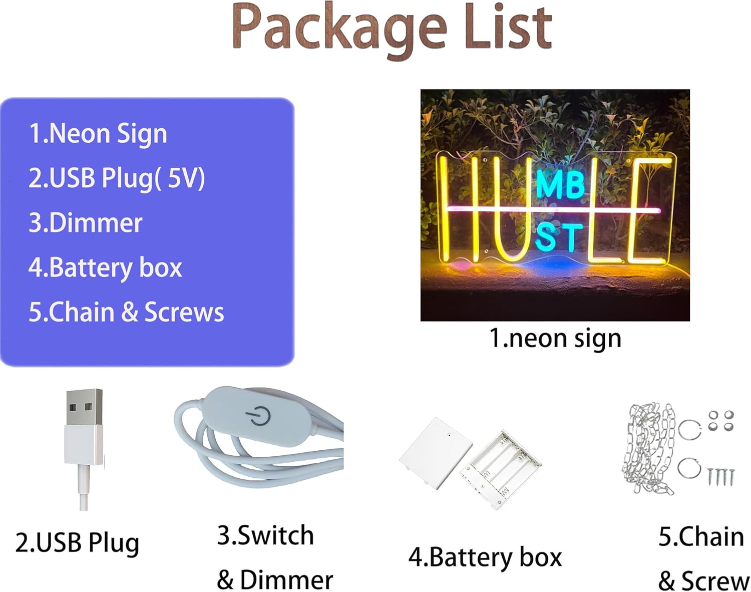 Hustle Neon Sign,LED Humble Neon Signs for Wall Decor,Light Up Signs for Office Room Bedroom Game Room Party Club Decor,Battery Box or USB Powered(Orange + Ice Blue)