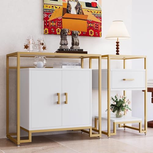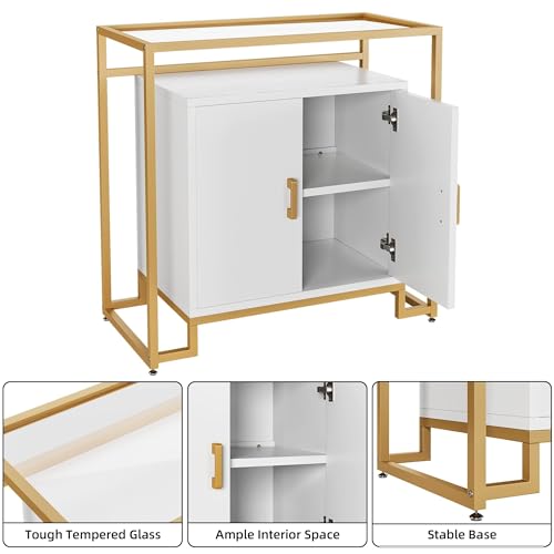 IDEALHOUSE 2024 New Sideboard Buffet Cabinet, Storage Cabinet with 2 Doors, Accent Console Table with Storage Space & Steel Frame and Tempered Glass Top, Nightstand for Bedroom, Kitchen, Office