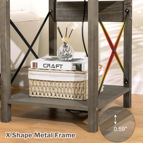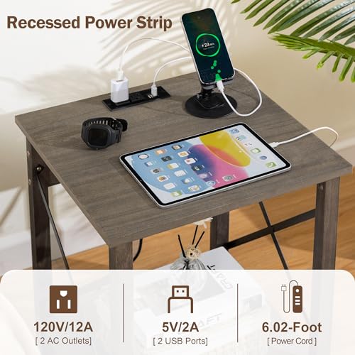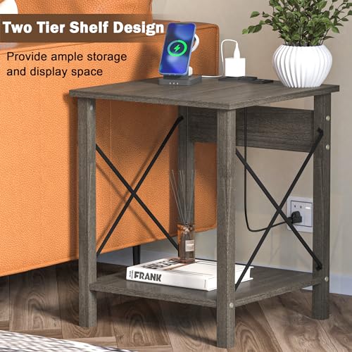 Farmhouse End Table for Living Room, 2 Tier Vintage Sofa Side Table with Charging Station and Storage Shlef, 17.7” Square Accent Entry Table for Small Space, Entryway, Bedroom (Rustic Brown)