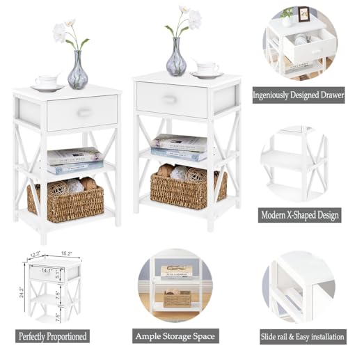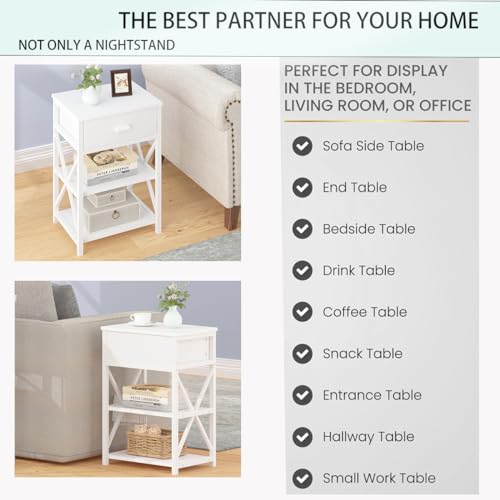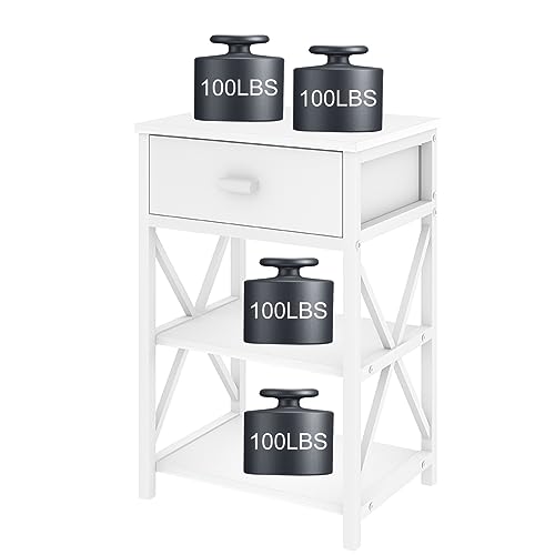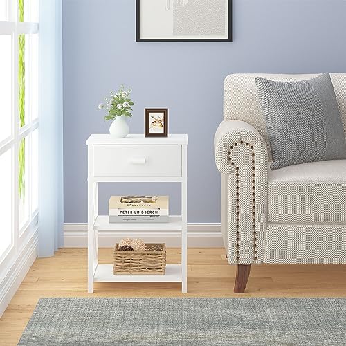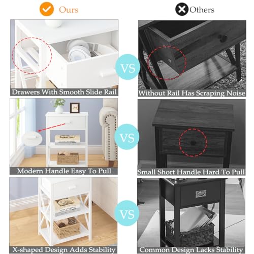 LVB Farmhouse Night Stand with Drawer, Small Industrial End Table with Storage Shelf, Minimalist Narrow Slim Wood Metal Side Table Set, Thin Nightstand for Bedroom Living Room Office, Light Grey, 16In