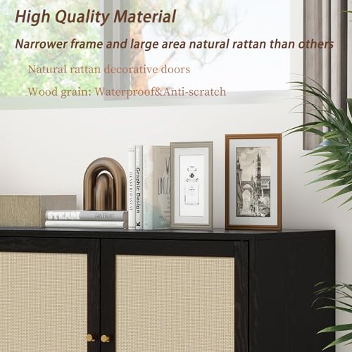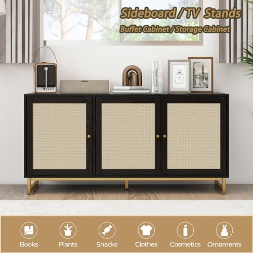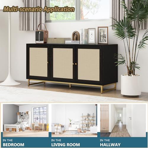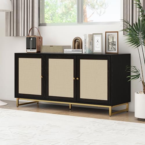 Rattan Buffet Cabinet with Storage-Wood Accent Sideboard with 3 Natural Rattan Doors,Adjustable Interior Shelves Console Table with Metal Frame for Living Room,Hallway,Entryway (Natural)